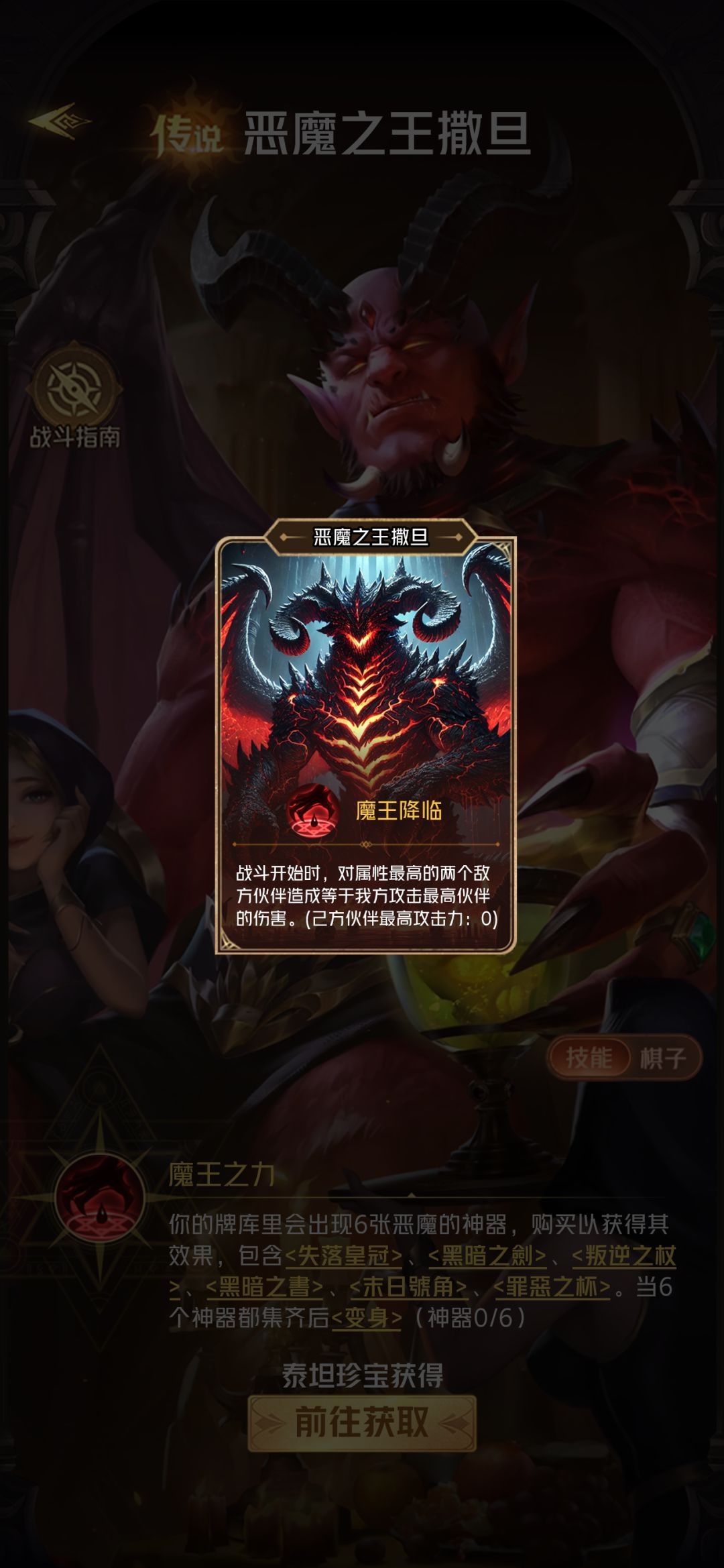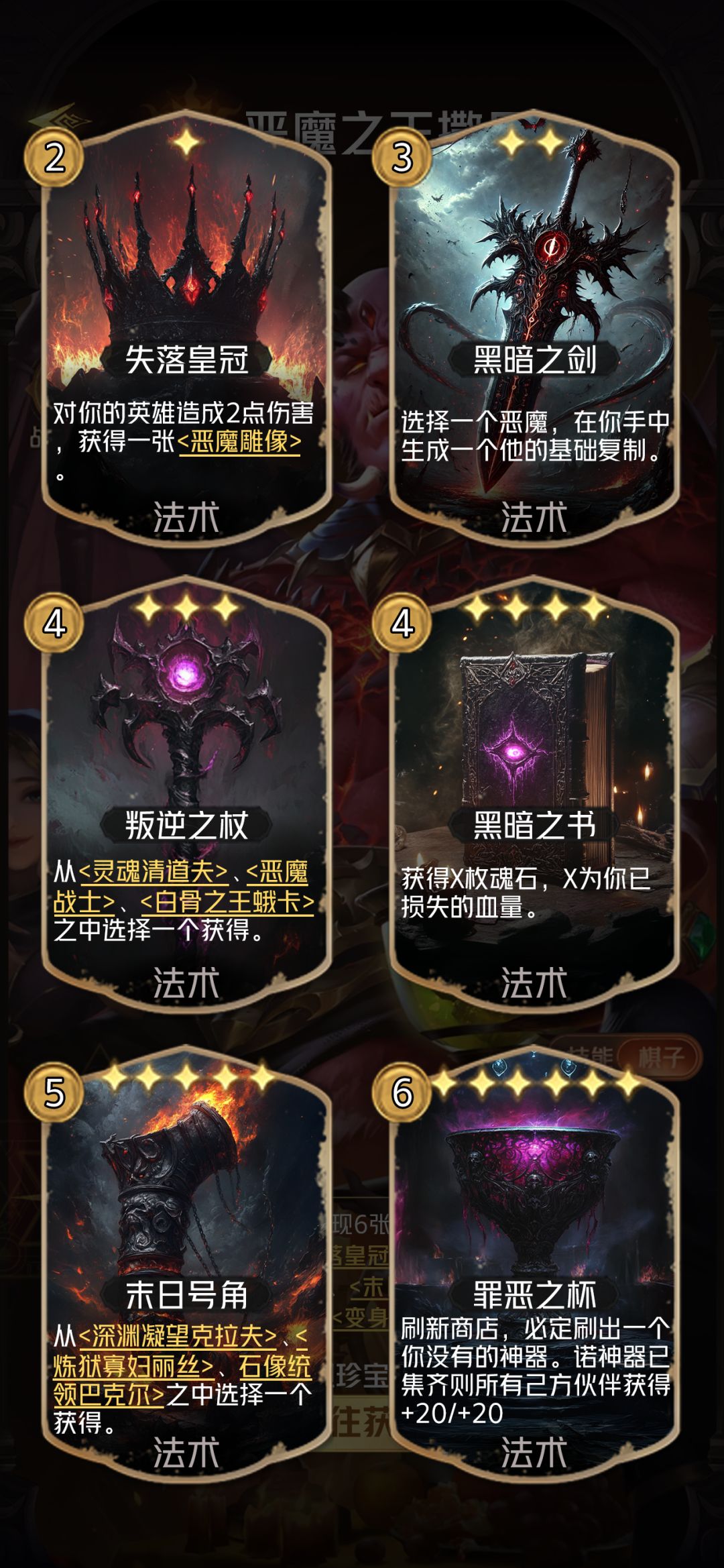 英雄棋子:【恶魔之王撒旦】★★,恶魔,3/3 , 打出:刷新商店,其中包含一个你未获得的神器。
