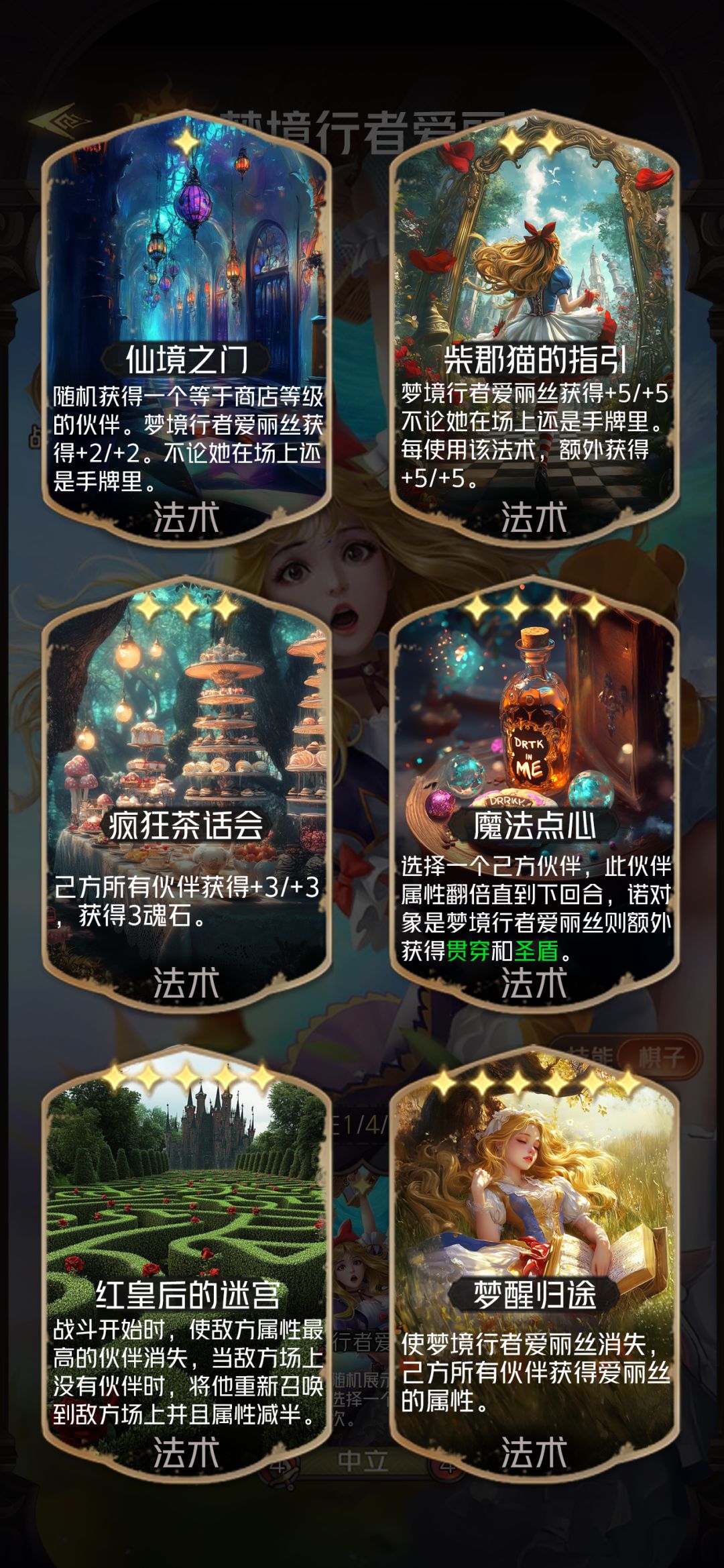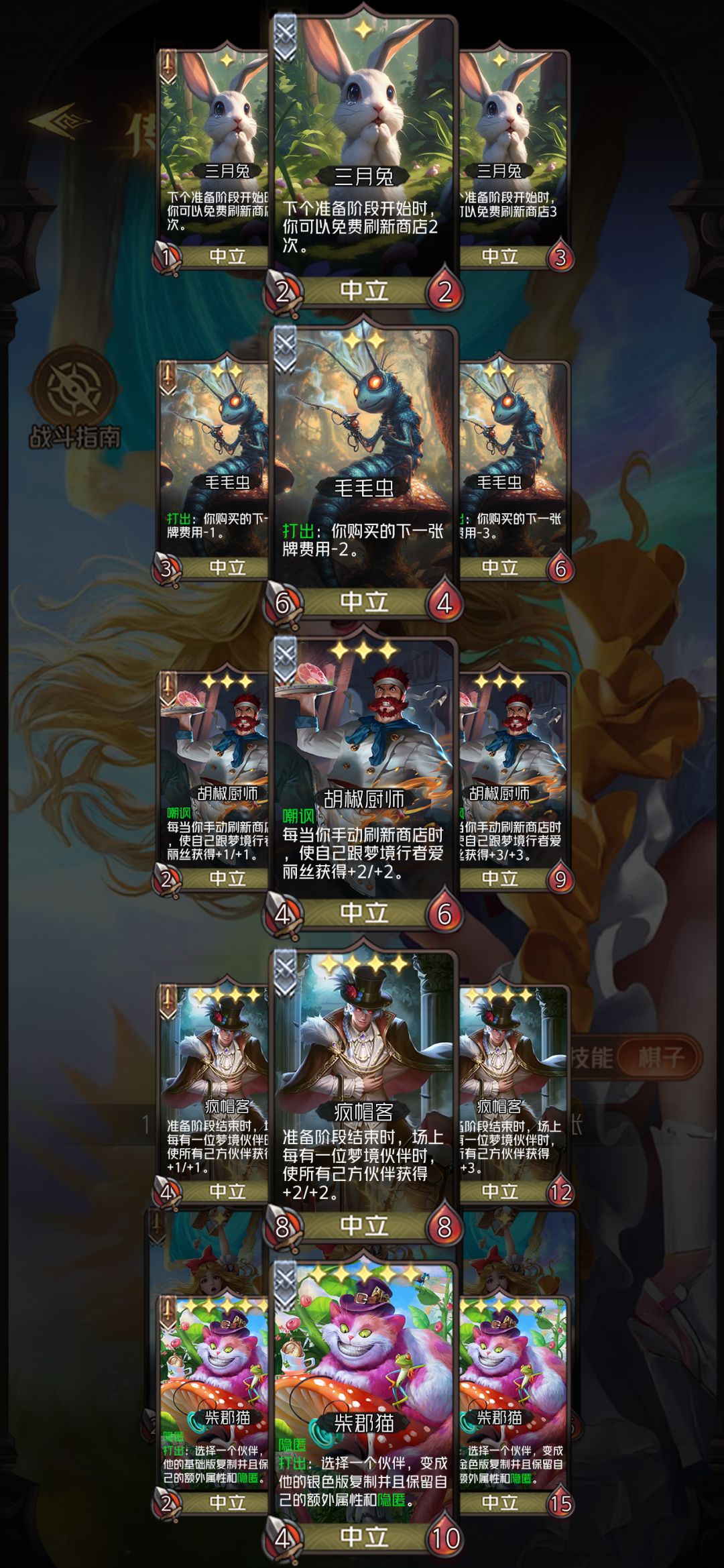 设计思路:爱丽丝追寻白兔先生再游戏里四处游走遇见新事物跟新朋友的故事。玩法是通过不断打出爱丽丝英雄棋子获得强力的梦境伙伴或者法术卡,而商店里不断会刷出<白兔先生>,找到白兔先生可以将爱丽丝移回手牌来让她重复打出以此获得大量梦境牌,梦境牌只能通过爱丽丝的技能获得所以这个游戏思路将围绕不断打出英雄棋子来积累战力和优势,梦境伙伴跟梦境卡可以赐予爱丽丝大量属性也能辅助经济跟战局。后期甚至可以通过舍弃爱丽丝得英雄棋子换取场面属性爆发提升。爱丽丝也是唯一一个有自己一套单独体系可以不需要依赖任何种族进行游玩的英雄。一起跟爱丽丝进行奇幻冒险吧!