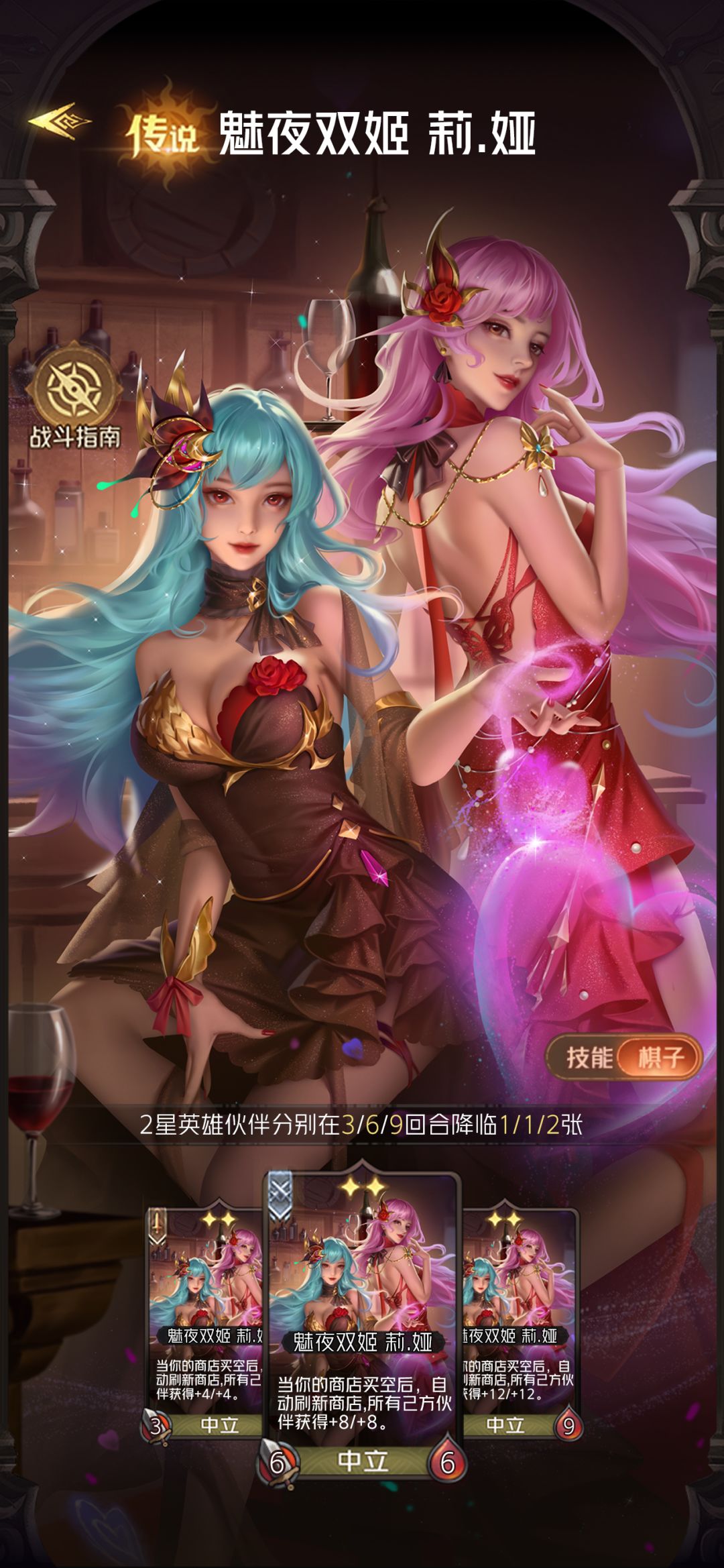 英雄棋子:【魅夜双姬 莉.娅】★★,中立,3/2 , 当你的商店买空后,自动刷新商店,所有己方伙伴获得+4/+4 +8/+8 +12/+12。