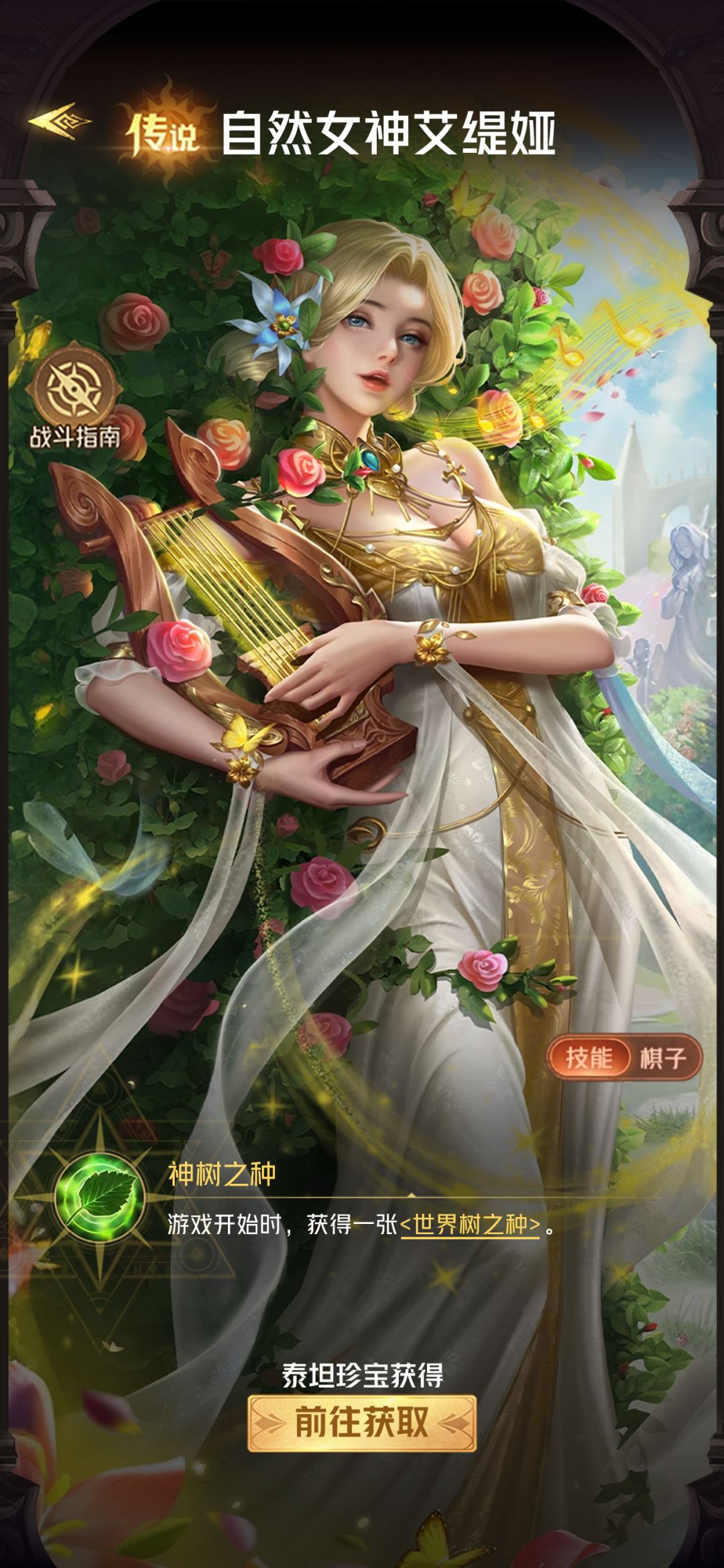 英雄棋子:【自然女神艾缇娅】 ★★,精灵,7/7 ,战斗开始时,使己方所有伙伴立即使用自然之力,每当己方精灵触发自然之力时,自己永久获得+4/+4。
