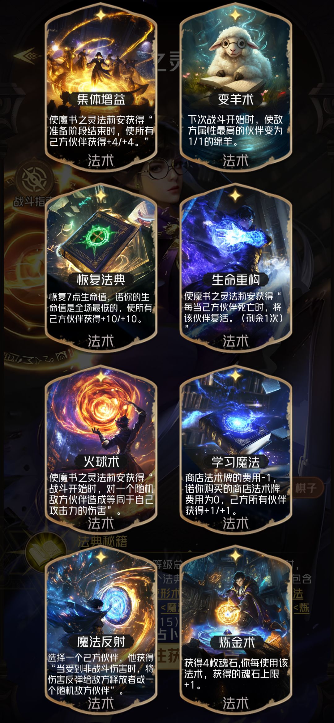 英雄棋子:【魔书之灵法莉安】★★,中立,2/3, 每当你从手牌中打出一张商店里购买的法术牌时,己方所有伙伴获得+1/+1/+2/+2/+3/+3.