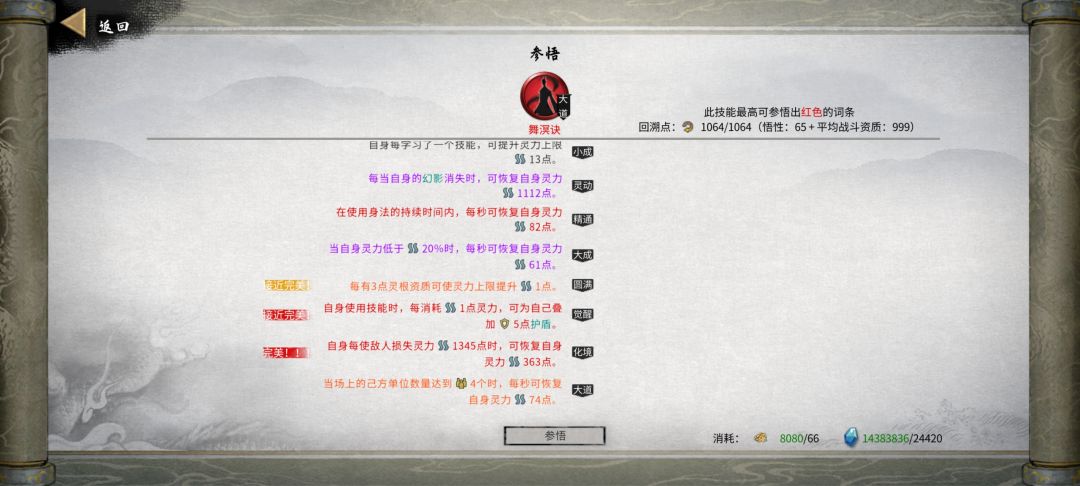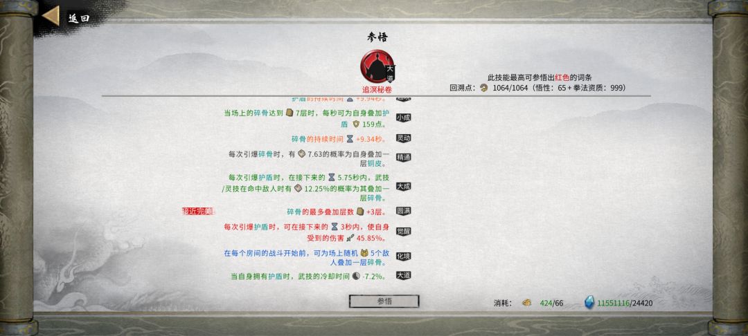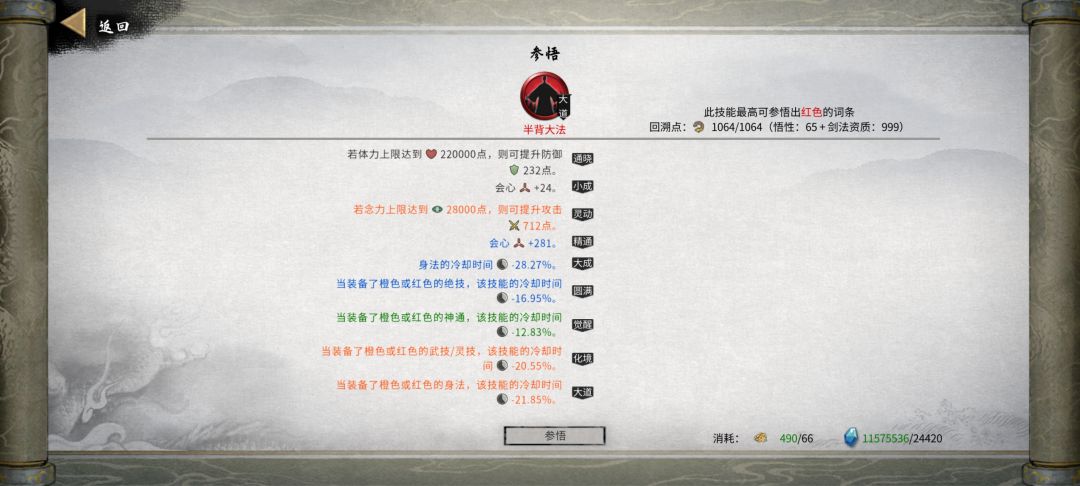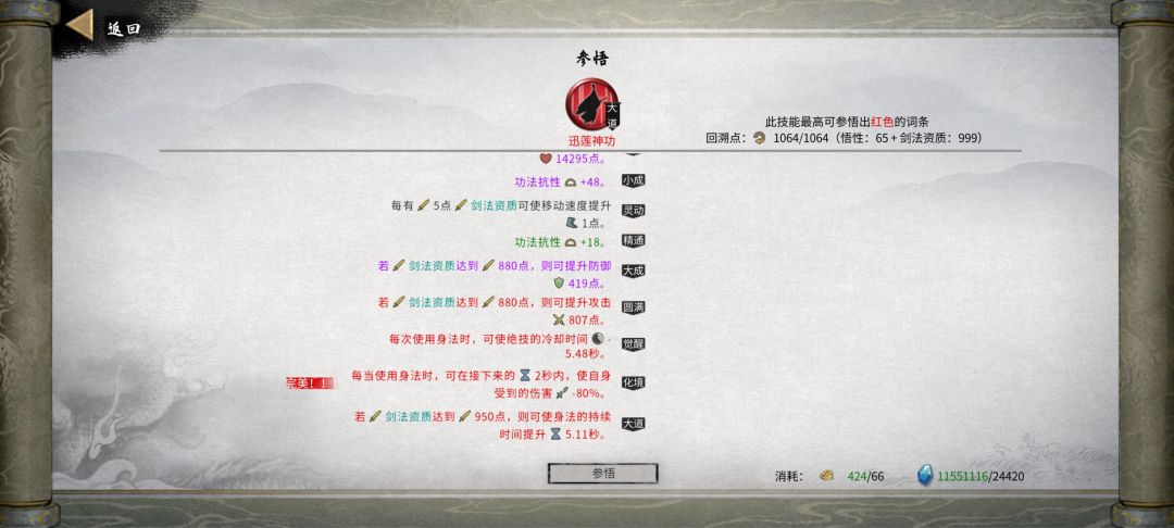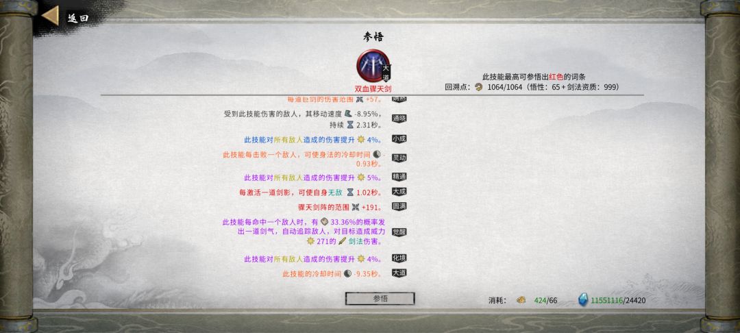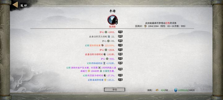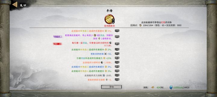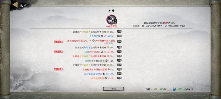 4.1功法(出去刚需还有一些比较重要的辅助,无非就是层数,范围,灵力消耗,流血威力,流血时间,数量,射程和上面说的减cd等)