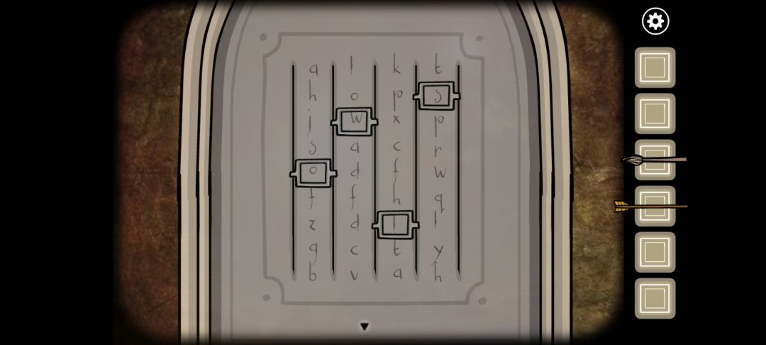 ◆前进场景,点击祭坛,开始解谜(将三个字母分别转动至下图所示):