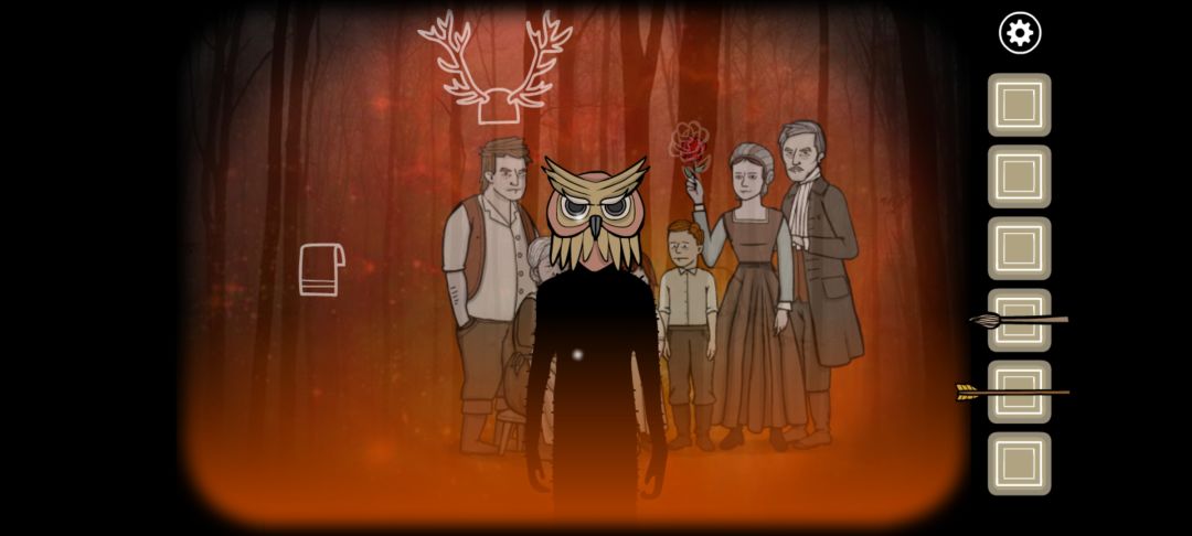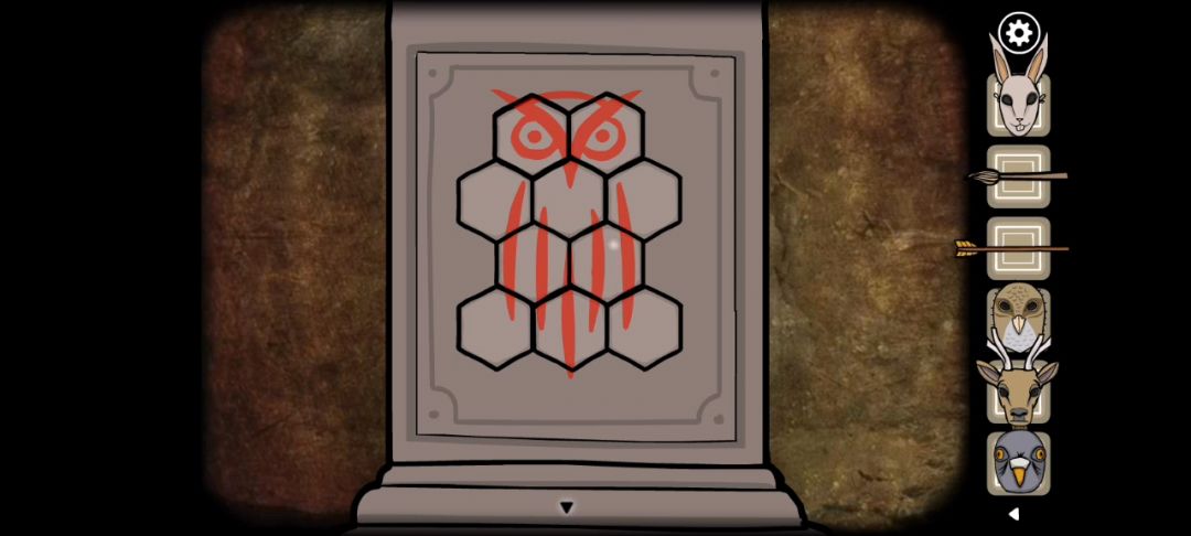 ◆此时上方的眼睛处周围灯全部亮起,点击上面的格子,进入暗室。进入场景后,点击左边红色的猫头鹰图案,点击格子可转动,开始解谜,将图案拼成以下样子即可:
