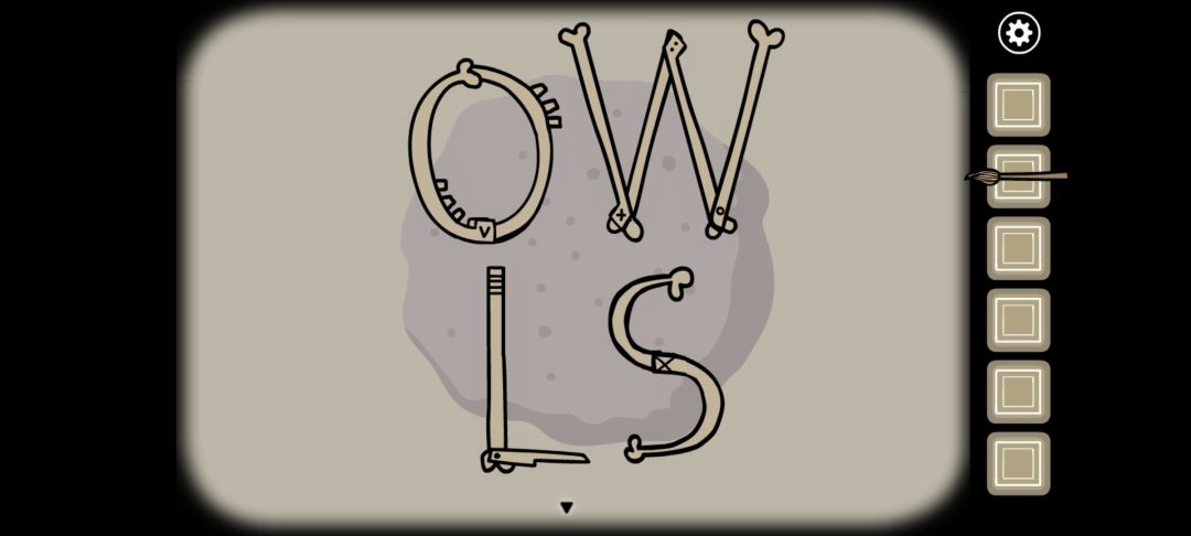 ◆回退至猫头鹰场景,把[小鸡]给猫头鹰,让它吐出一堆鸡骨头,回退场景后点击地上的鸡骨头,开始解谜(把骨头摆成下图所示):