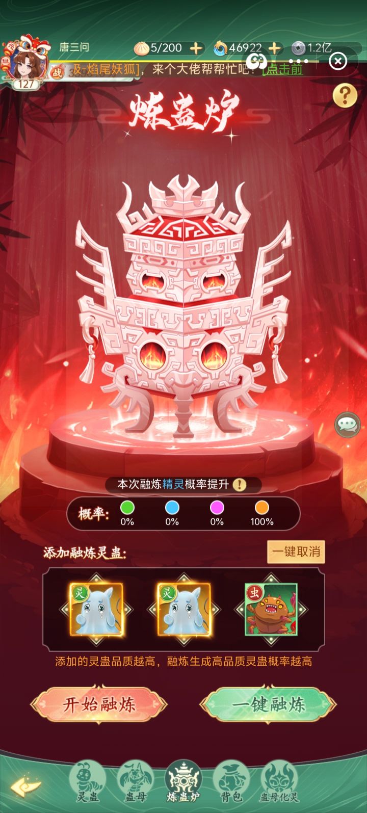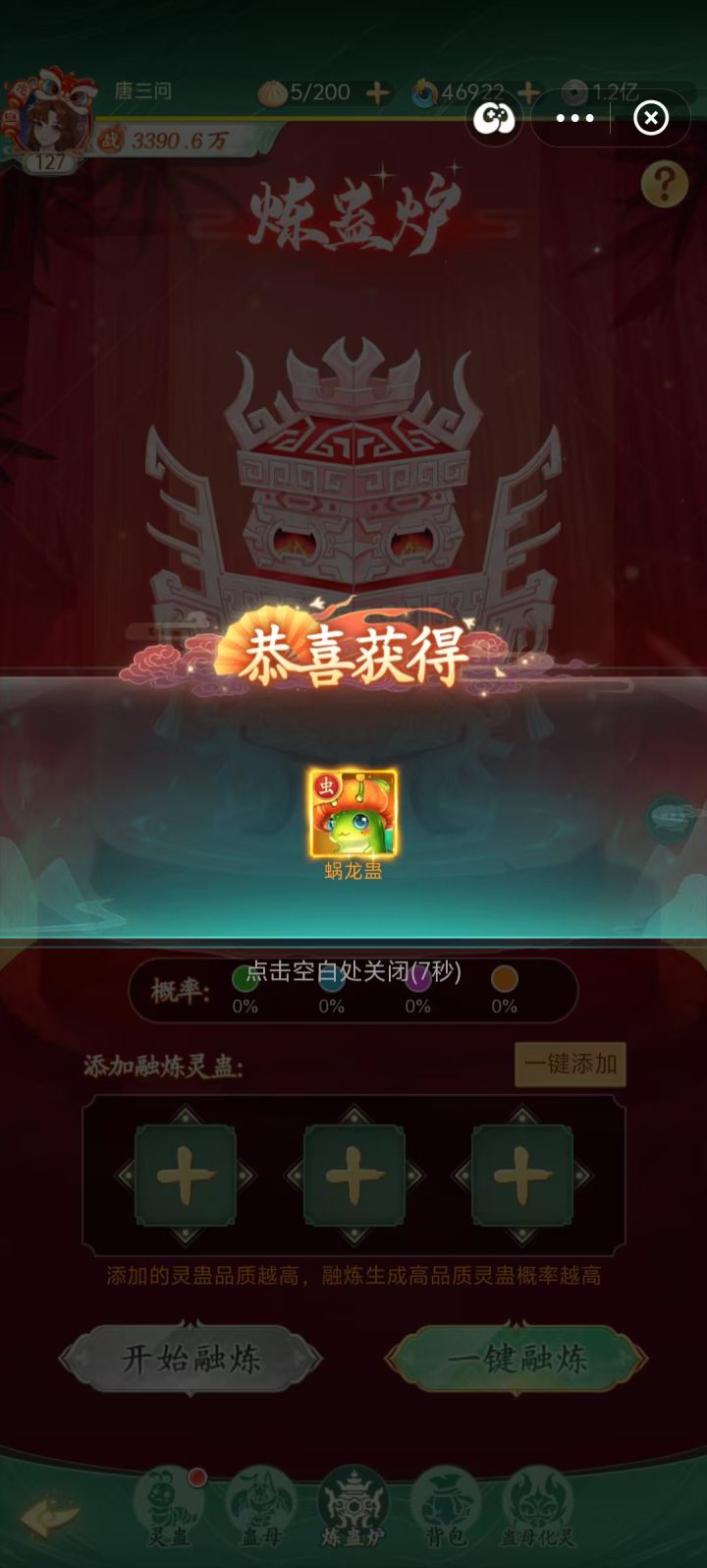 幽灵蛊出的机率太高了,已经满星了,还多出了4个,没办法直接融试试,本想直接放3个幽灵,但系统提示,只要放2个就能百分百出金蛊了,就随便放了个绿蛊,没想到合到了一个新蛊,蜗龙蛊,惊喜!!