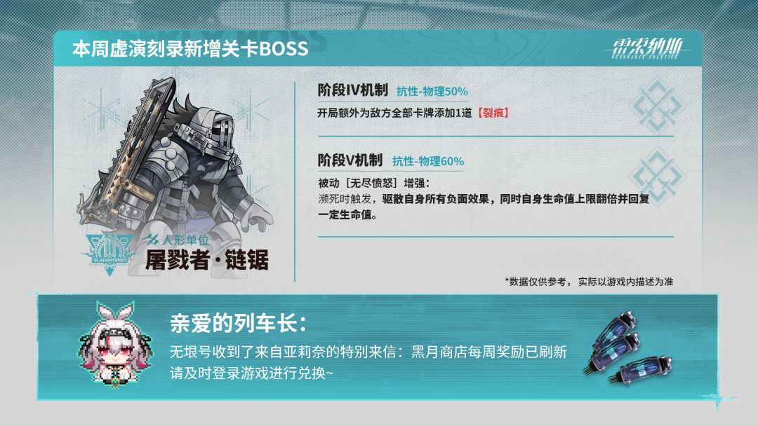 本周黑月商店货物及异构厄枝已刷新,请列车长及时登录游戏进行查看~