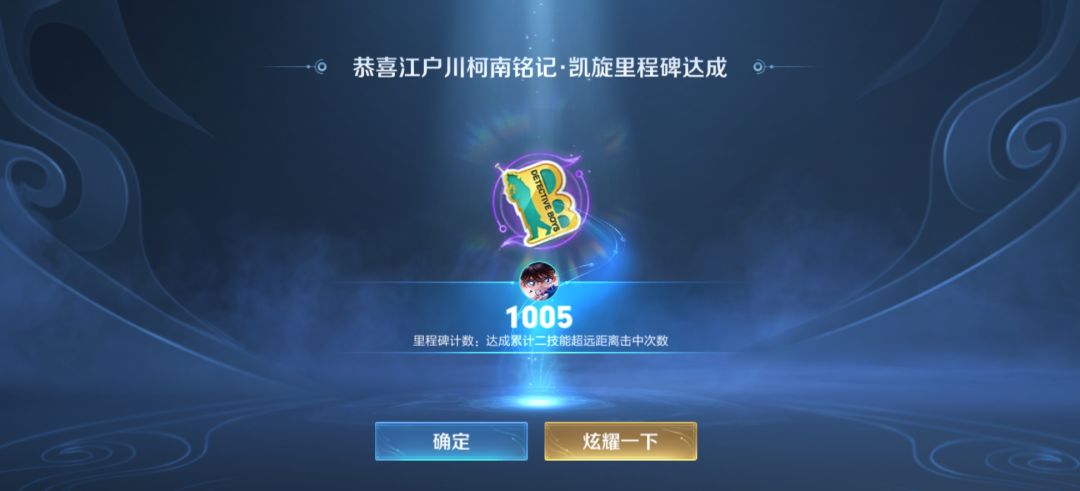 另外,如果有柯南皮的话,最好用柯南皮,会有很炫酷的荣耀播报,还有柯南的铭记,能记录你的二技能次数,刷这个标,也巨好玩!