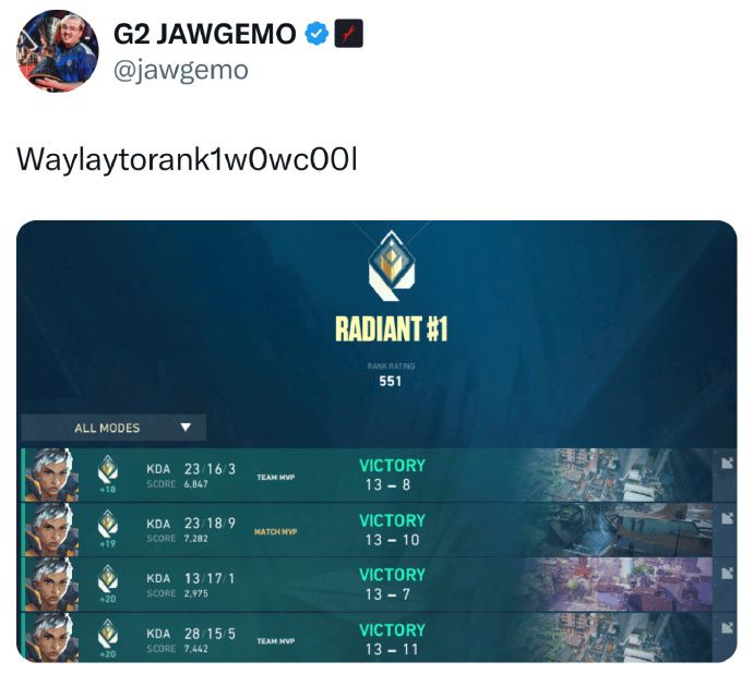 G2选手Jawgemo使用幻棱打上美服rank第一!