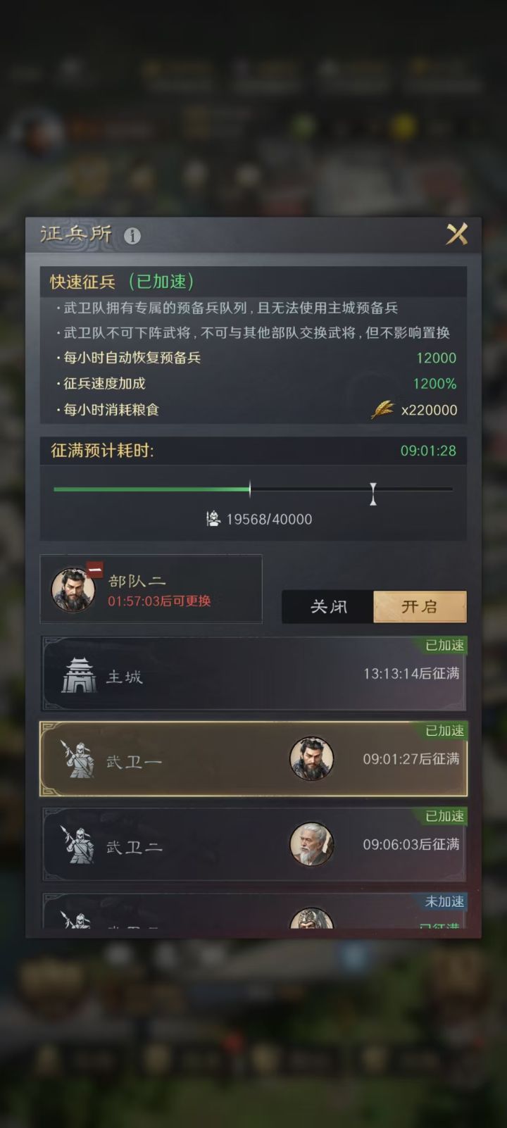 - **绑定策略**:通常武卫营1绑定3队(开加速,是否开启视粮食储备而定);武卫营2绑定4队(关加速);武卫营3绑定5队(关加速)。这样每天前3队战斗力较强,4队和5队有兵就拉出去作战,没兵就挂着讨贼。