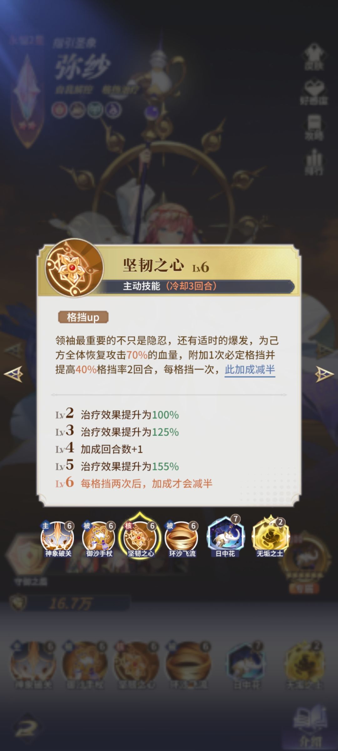 弥纱是传说法攻角色,不仅能为全队进行治疗,快速恢复,还可以附加一次必定格挡效果,增加防御力,提高团队续航时间,而且可以对4名敌人发动攻击,附加30%的易伤效果,持续时间较长。