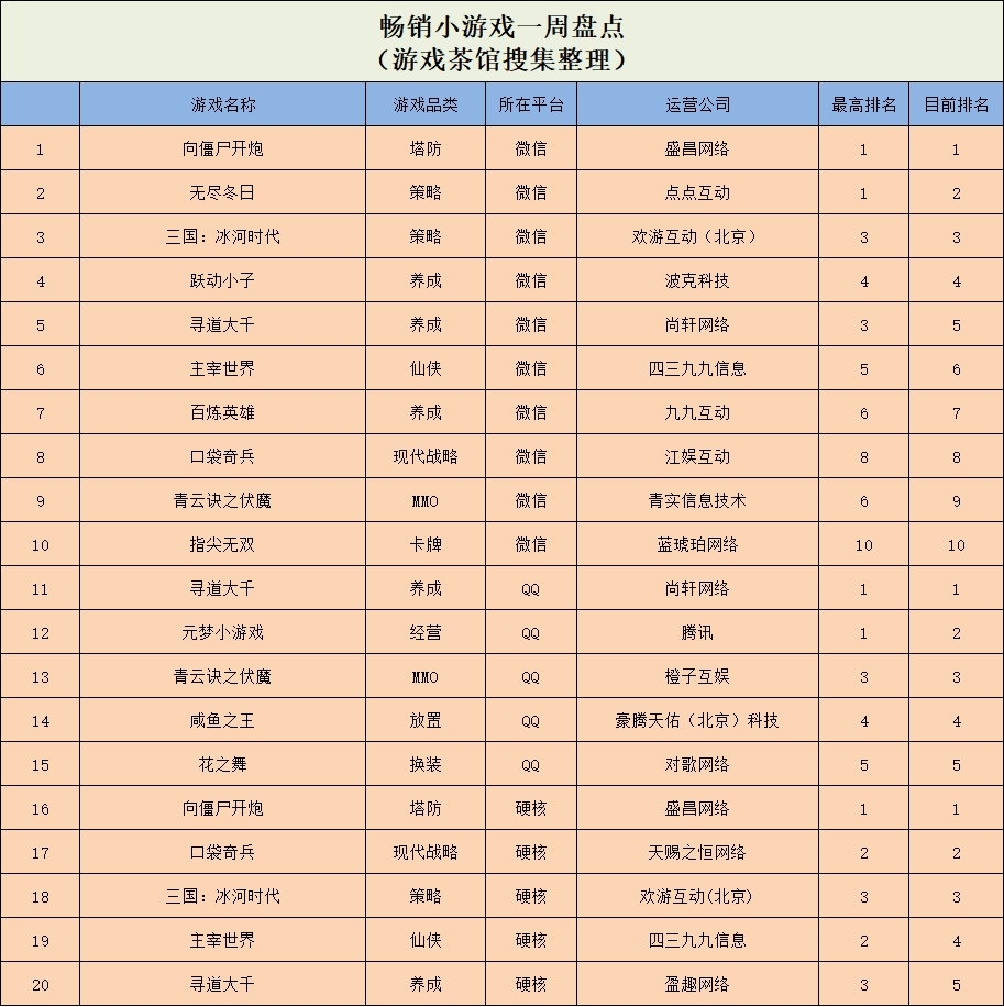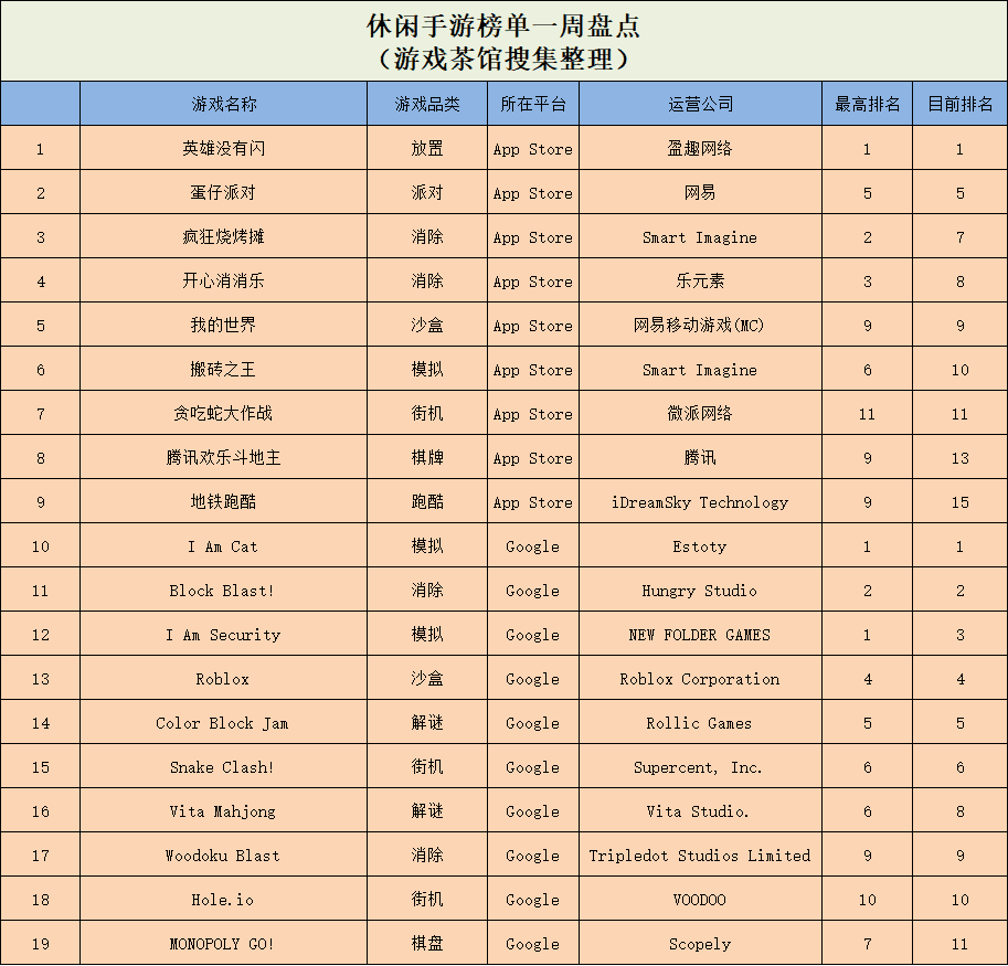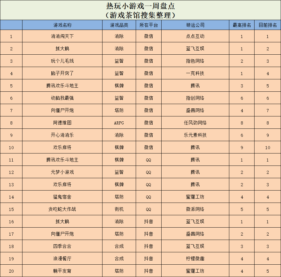 休闲新游周报每周统计微信小游戏、QQ小游戏、抖音小游戏、硬核小游戏以及App Store和Google Play上的新游爆款,并按照分类制作表格,将游戏排名情况等信息进行整理,希望给到行业同侪帮助。