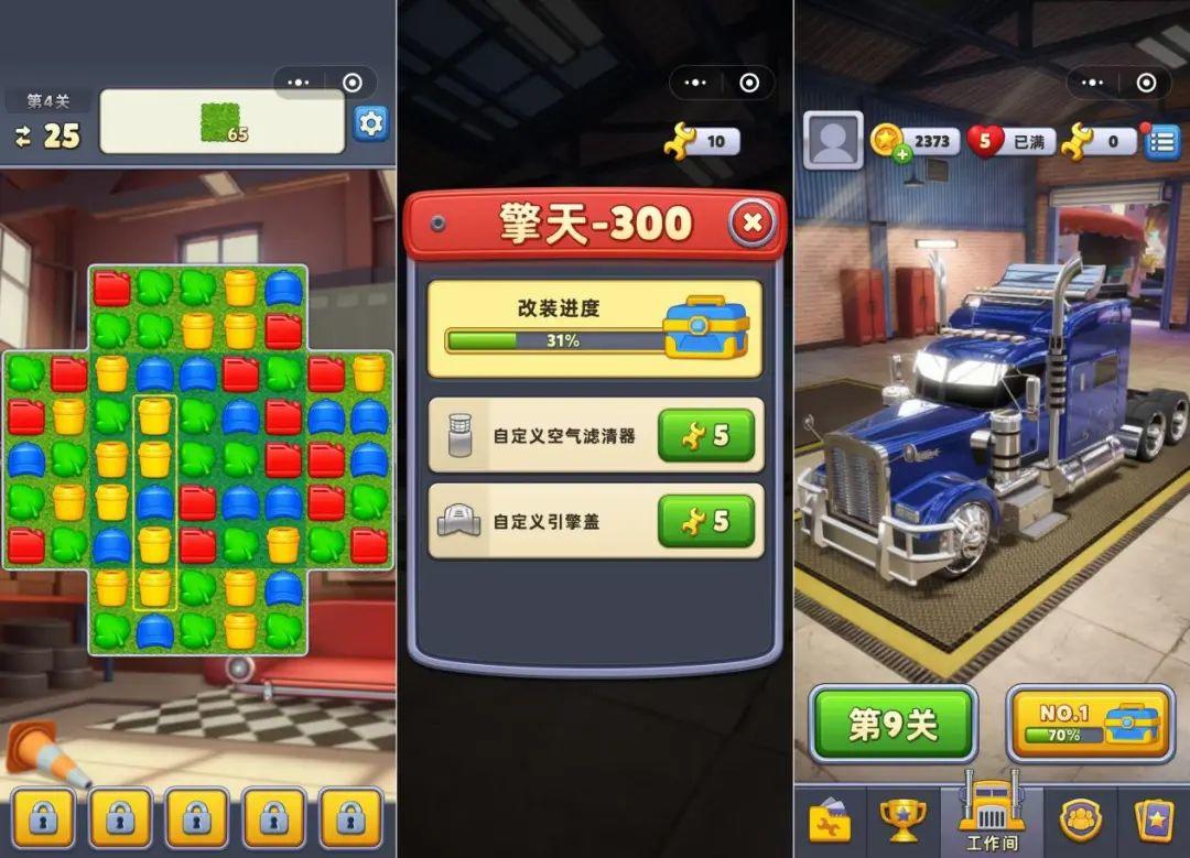 在微信小游戏人气榜单中,点点互动旗下新游《消消闯天下》空降榜单第一,这款游戏是一款车辆改造题材的消除游戏,整体玩法类似于《Royal Match》,玩家在游戏中通过三消关卡,即可获得扳手奖励,这些扳手随即可被用于改造各种车辆。通过闯关,玩家可以将废旧车辆改造成各种自己喜欢的模样。