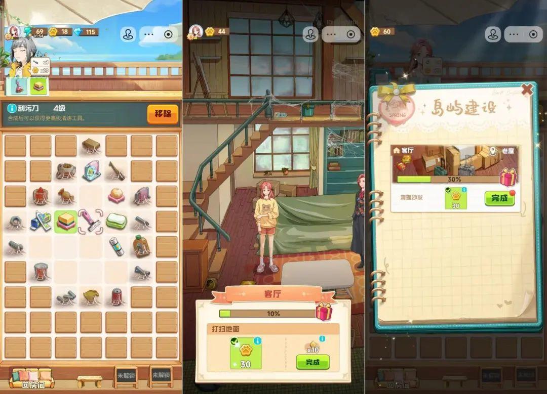 《四季合合》是一款标准的二合游戏,核心玩法融合了棋牌合成+经营改造,玩家只需要对棋盘中的元素进行两两合成,完成对应的合成任务,即可获得金币奖励,拥有金币之后,我们就可以对岛屿上的各个地方进行改造和建设,一步步打造出一个漂亮宜居的美丽小岛。