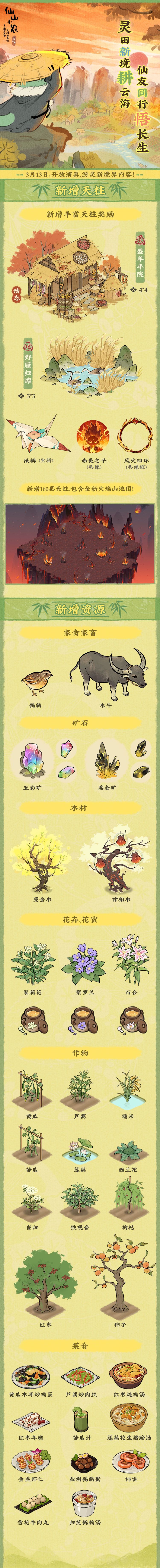 各位小农们好,小帮工带来好消息了,仙山上新啦!本次更新将开放80级至120级内容,带来丰富的天柱奖励以及全新的资源。让我们一同踏入「灵田新境」,耕云海、悟长生,开启修仙种地新篇章!