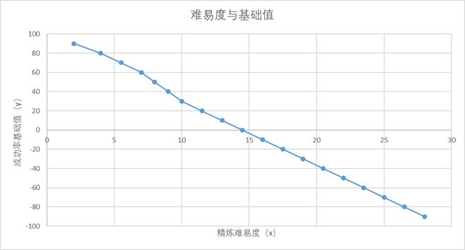 成功率基础值和难易度相关且由难易度转化而来,精炼难易度与成功率基础值之间呈负相关。