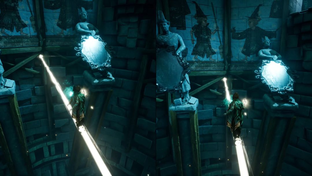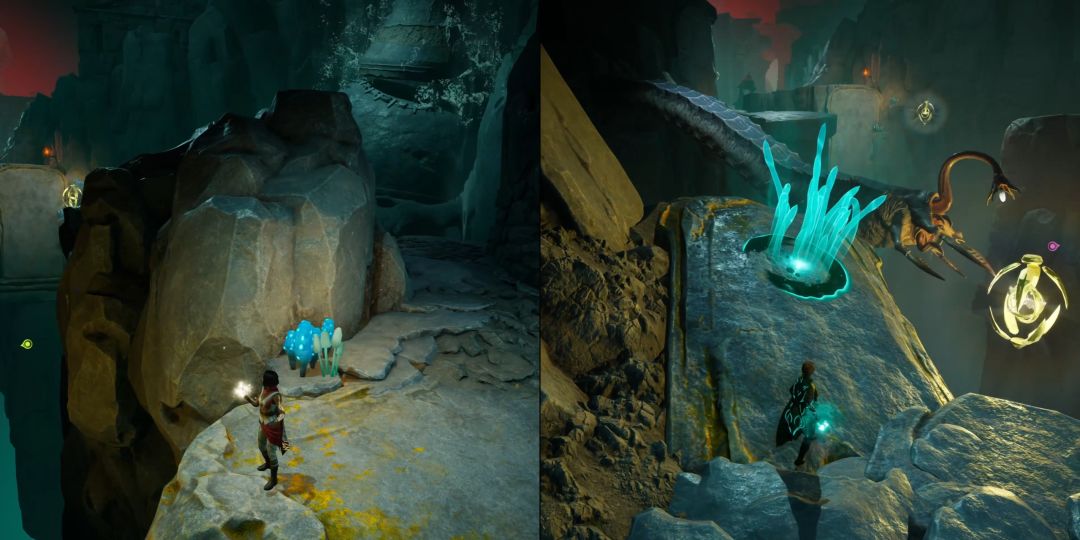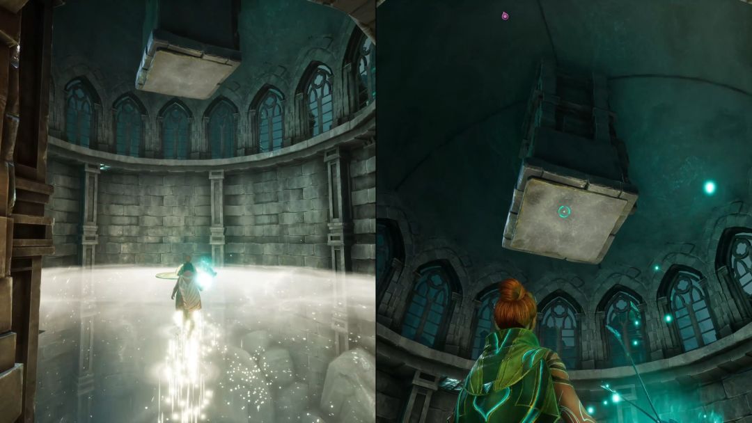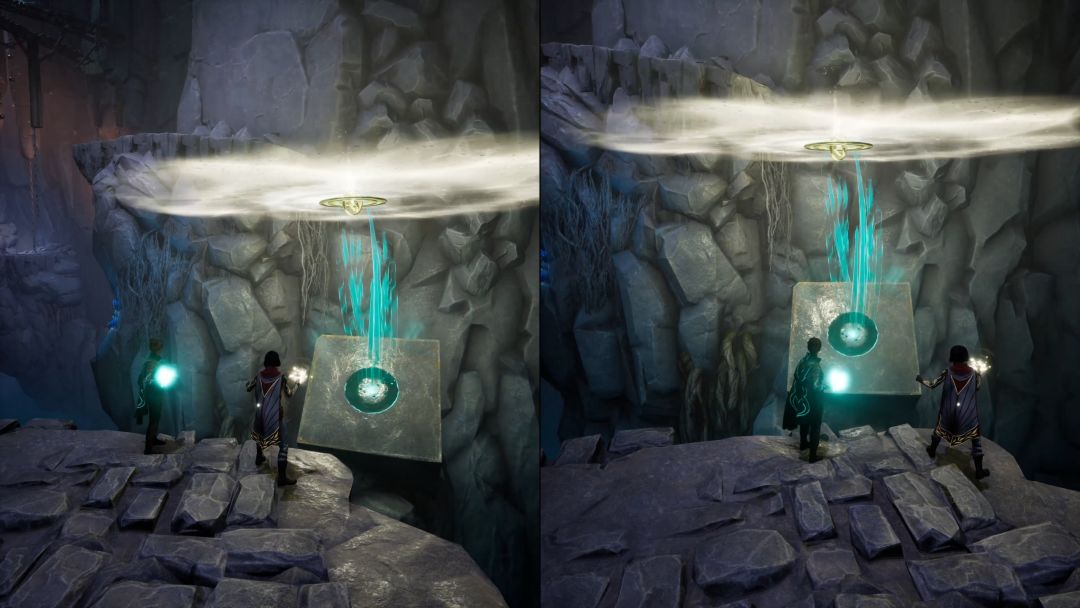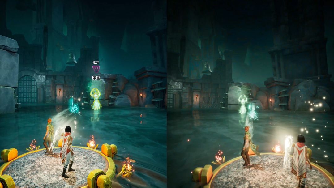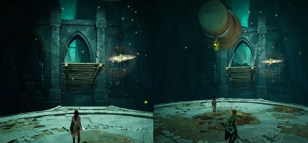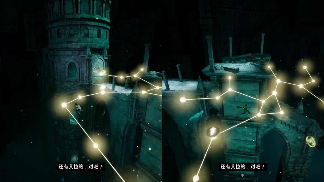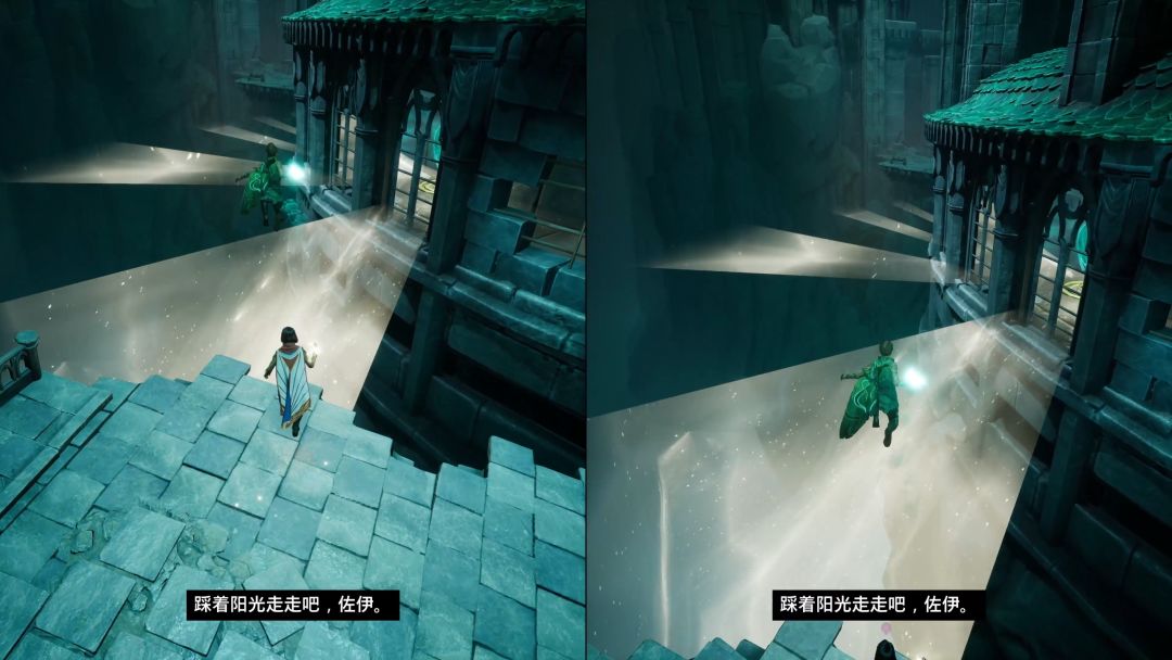 点亮光路后,抬头另一个队友负责抓取石板将大家位置上升