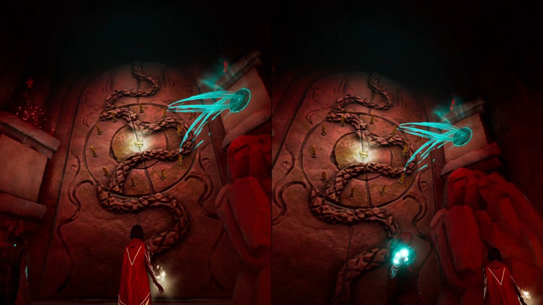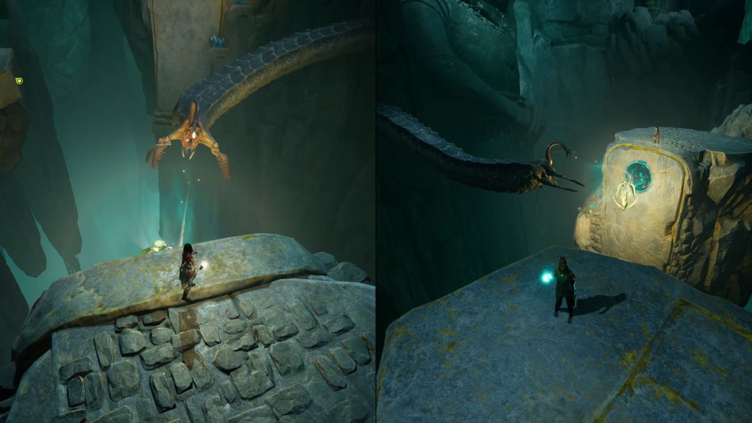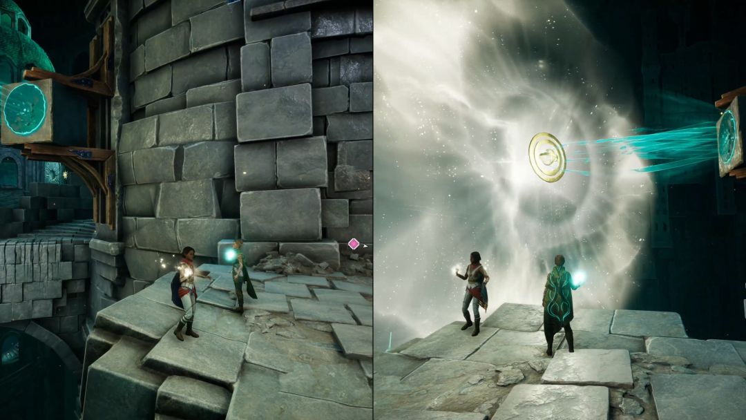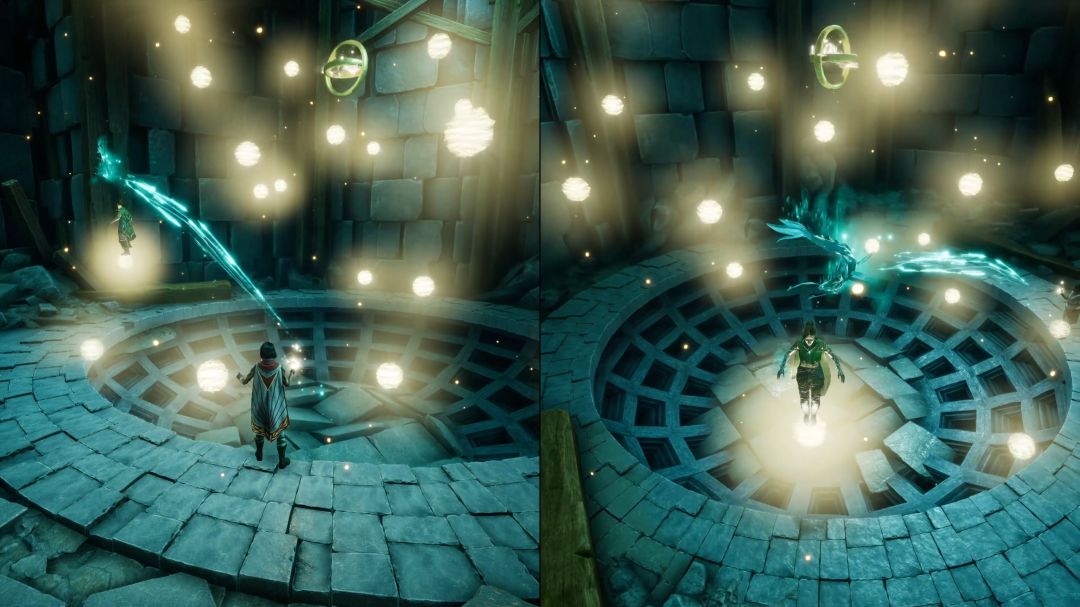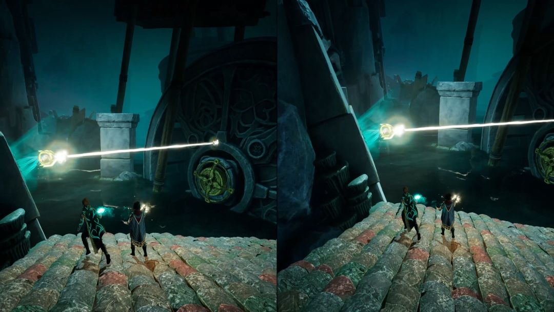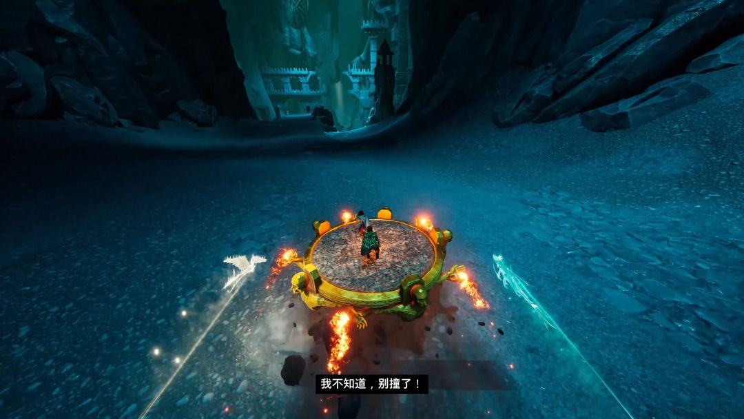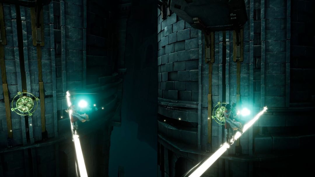 点亮光路后,抬头另一个队友负责抓取石板将大家位置上升
