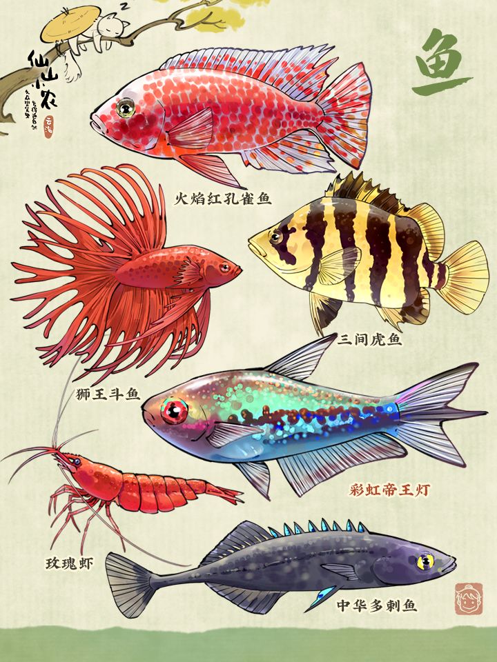 除两种罕见鱼类外,游戏内也新增了像盛开花朵般的五花兰寿、颜色绮丽如玫瑰的玫瑰虾、性情温和的火焰红孔雀鱼、体侧有老虎一样花纹的三间虎鱼、有两条淡蓝条纹的蓝纹小丑鱼,尾部像雄狮面部鬃毛的狮王斗鱼、形似斑马的斑马拟丽鱼、以养分丰富的腐殖质为食的清道夫鱼。