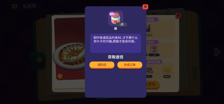 3.快速直到达调料店: 菜品——私房菜——随便打开一个点击上面的调料——点击调料店。(该方法同样适用酱料店等)