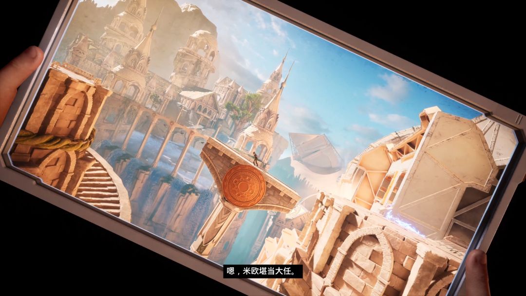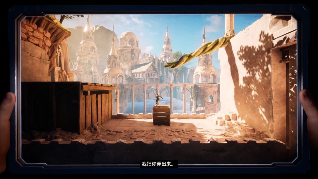 两人不同视角但是相同物品,跳上并抓住它飞往下一处地点