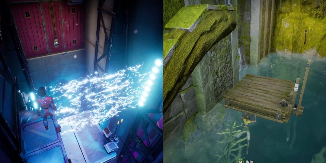 右边的负责跳入水中将面板拖向队友,而队友跳上去即可