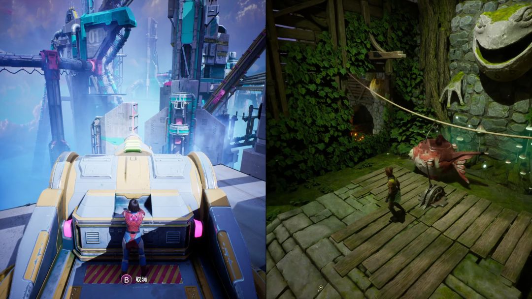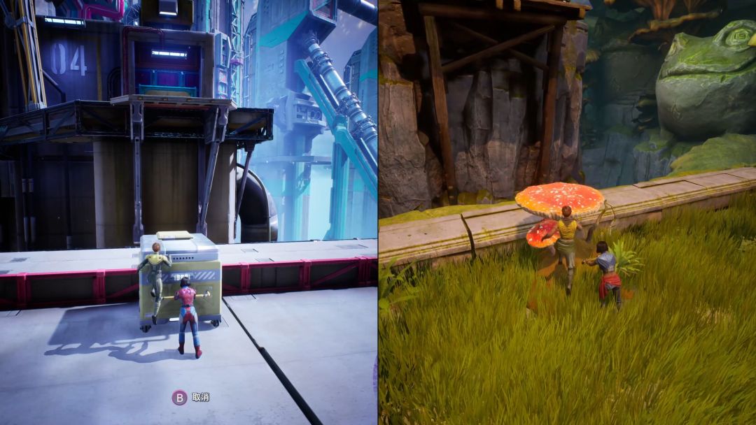 一人负责拉取推车(蘑菇),另一人从蘑菇上弹跳到上面平台