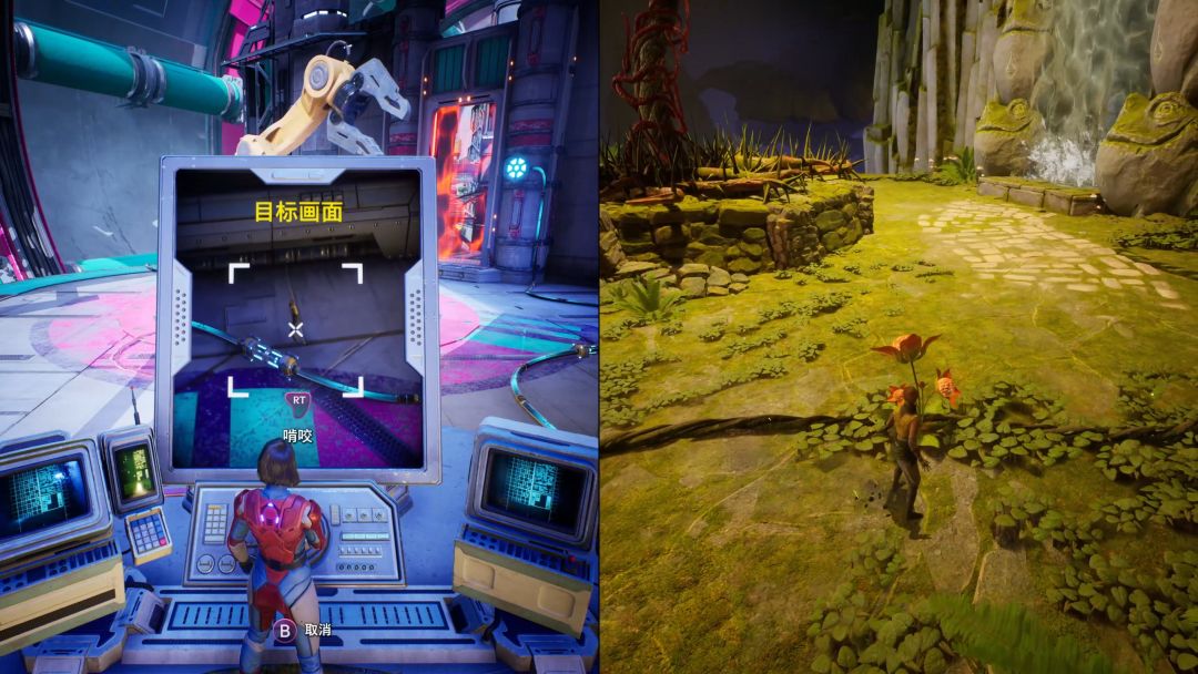 左边使用机器控制啃咬与目标方向,右边带领视线并在画面中看到是输电装置位置,进行啃咬