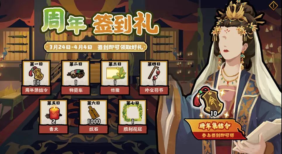 上线就送十连抽,是兄弟就和我一起(串味了)。签到赠送10个周年季节令,可用于周年庆自选演化池中,选择心仪的名臣,同时还有全新头像框赠送哦~