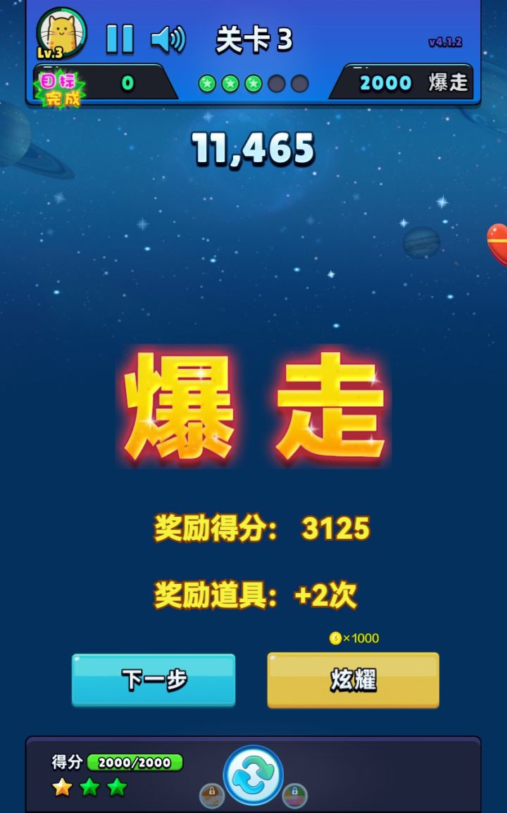 我消除了所有星星,完成第1次爆走了!!!获得3125分奖励!