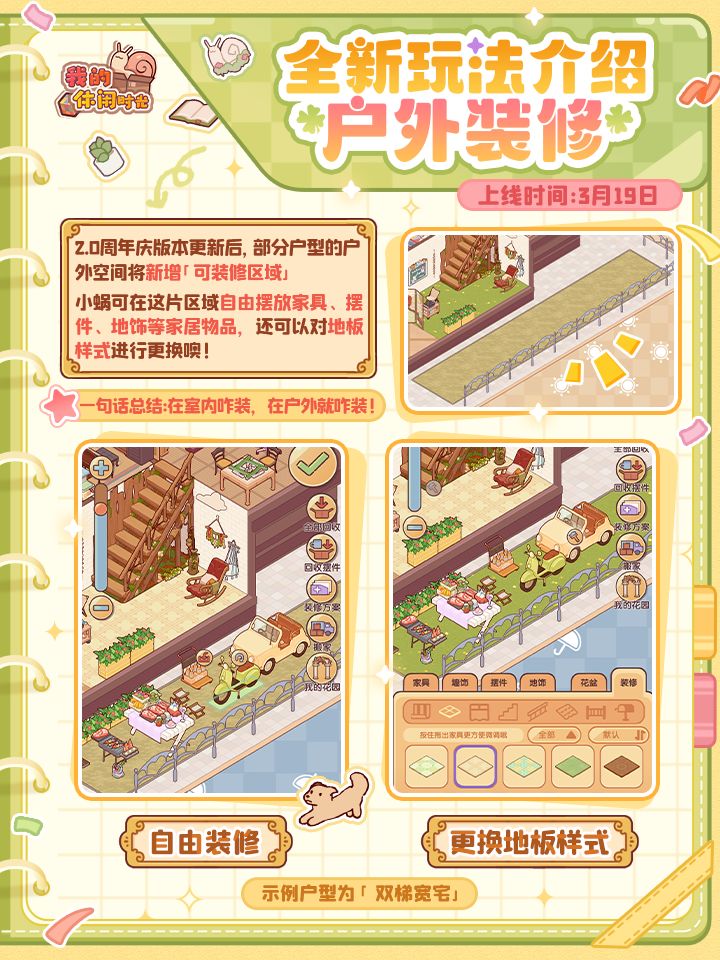 ⭐️全新玩法「户外装修」即将上线!届时,小蜗可在户外空间指定区域内自由摆放家具进行装修设计,还可以对该区域的地板样式进行更换噢!