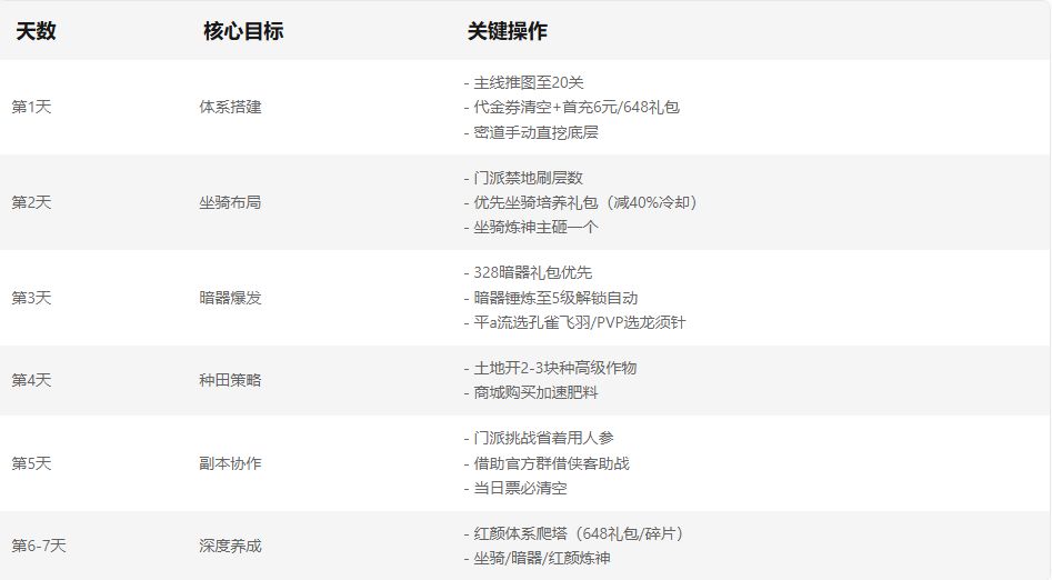 - 首日:648金券礼包>侠客平均升级>密道修炼