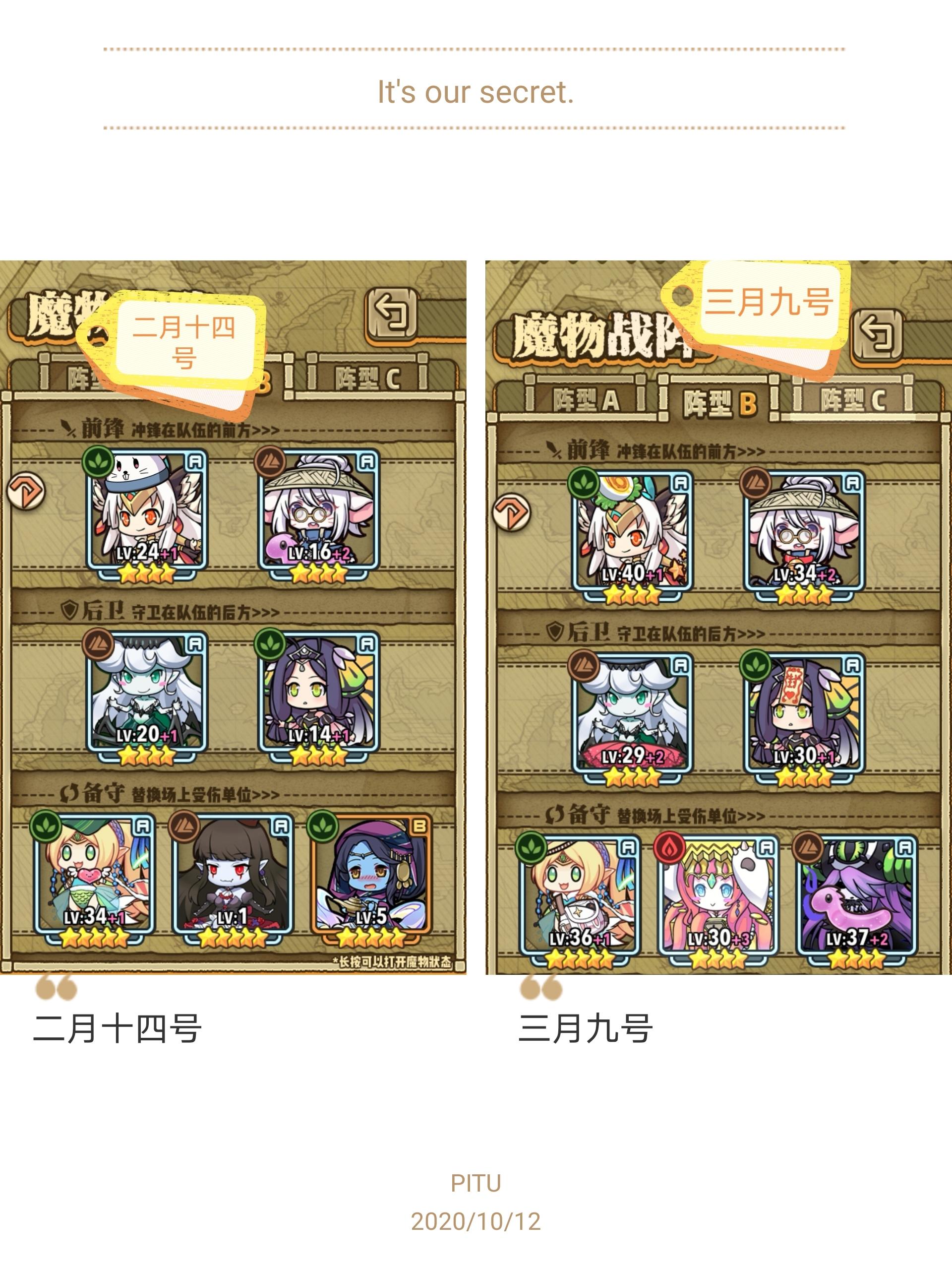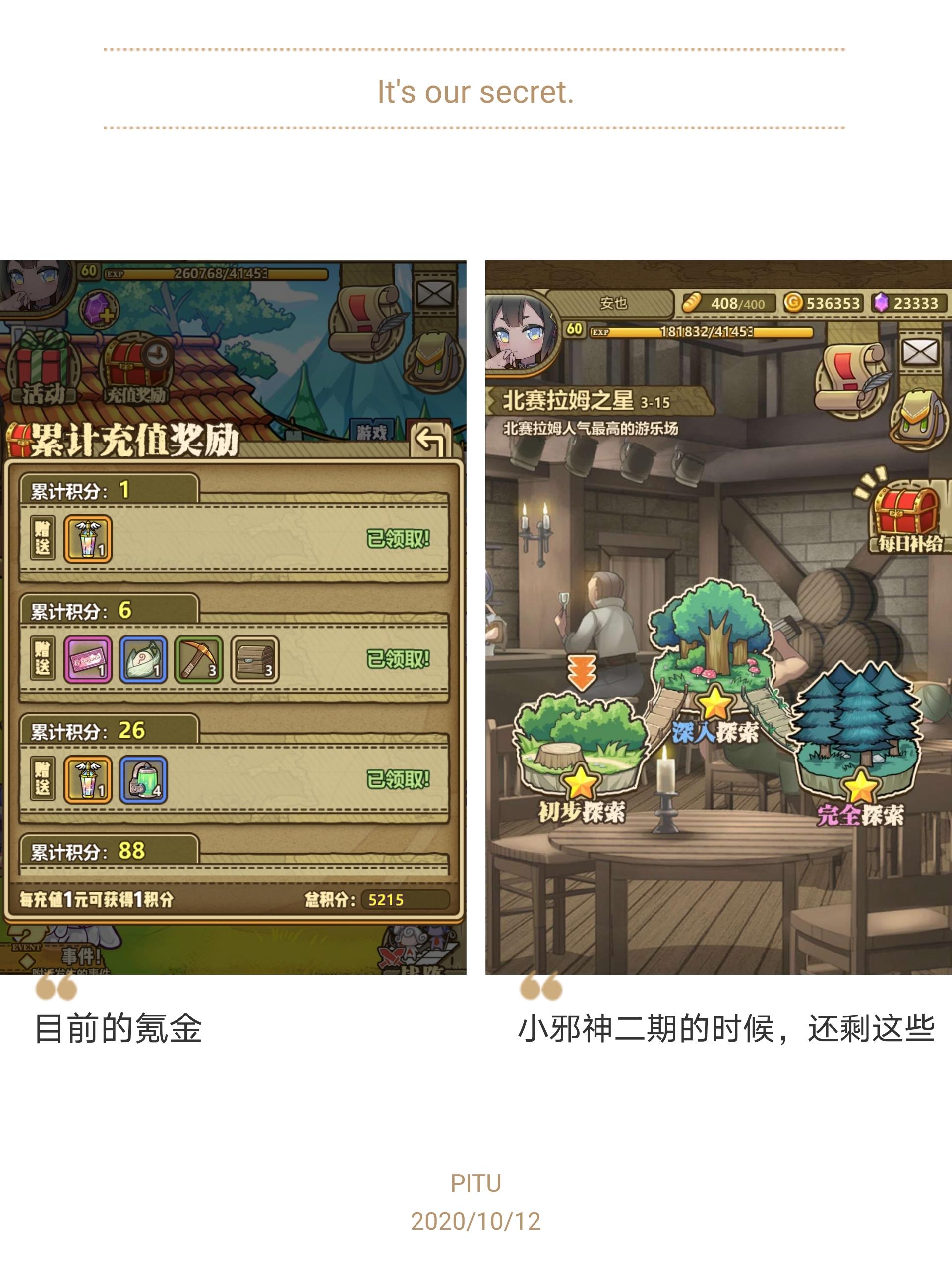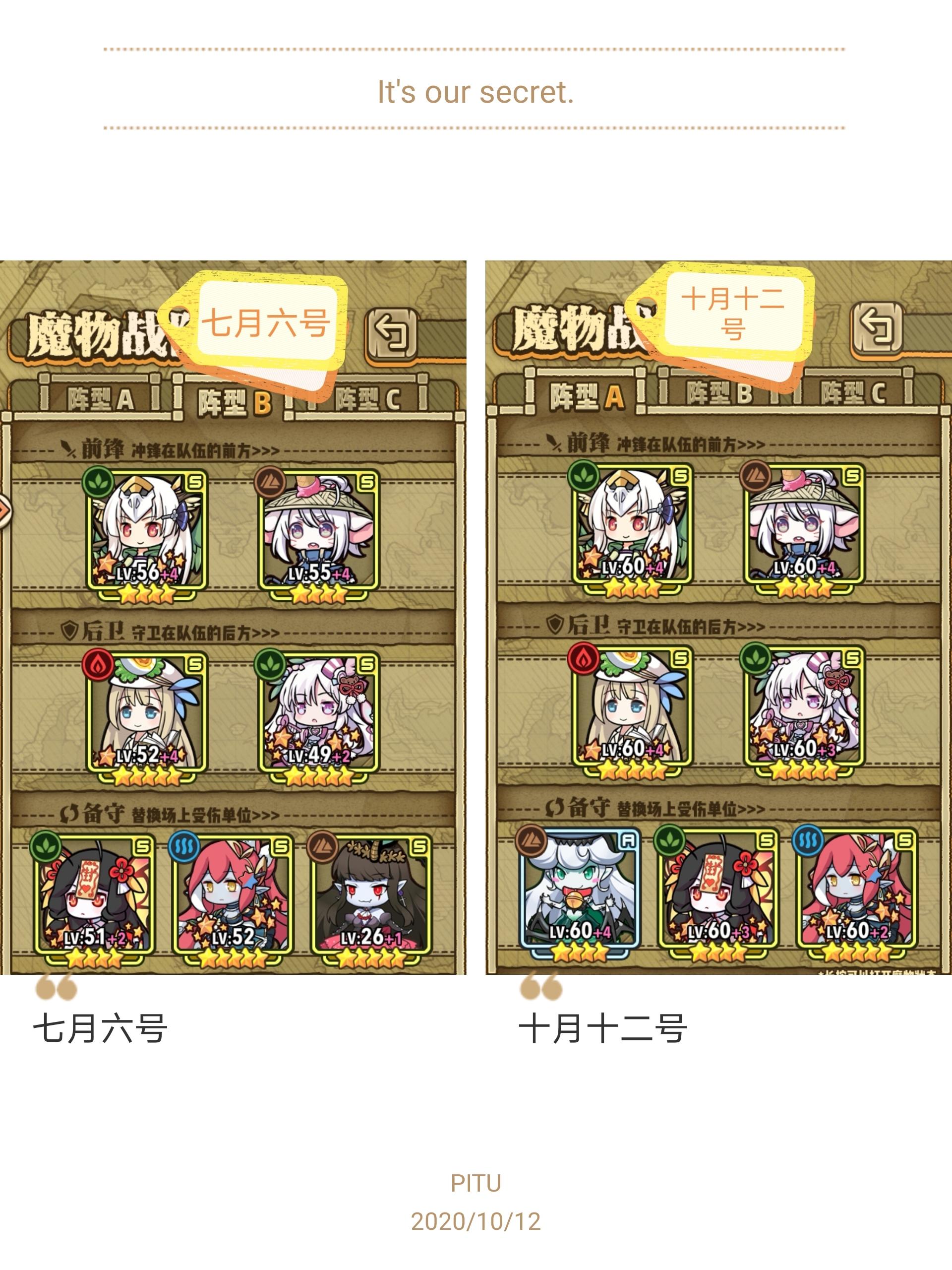 从今天春节回坑到现在,从重新开始到萌新阶段,用了八个月左右的时间,回坑阶段赶上春节蛋池,换上了狮鹫老鼠蝴蝶,核心完成,周年庆阶段换上了太太,队伍基本定型,周年庆关闭后,用彩姆姆白姆姆给阵容破潜,虽然只有四个太太,也努力满破了🤣🤣,我是属于图鉴玩家,没赶上法夫纳166那期是我一生的痛呜呜呜呜呜,太喜欢法夫纳了,小氪了一些,现在终于可以冲击二队啦,冲鸭冲鸭。小邪神这期,有一次凑巧摸到了很好玩的氪金数,也一起放出来吧