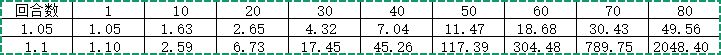 当利率为1.05和1.1时,经过不同的回合数,余额变为原来的多少倍