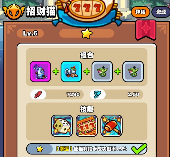 第七至九回合:升级召唤概率到5级后花钱召唤补充战斗力,打死石头人后有两种情况,狗运爆棚,召唤出金,则消耗幸运币进行强化,若未出金,则进行三次传说召唤,完成三输任务获得200金币继续补充战斗力或者狗运出金。