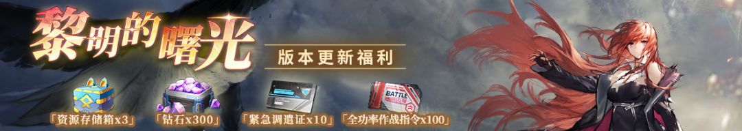 版本更新特别补给:「钻石 ×300」「紧急调遣证 ×10」「资源存储箱 ×3」「全功率作战指令 ×100」指挥官可以登录游戏,从邮件中领取。
