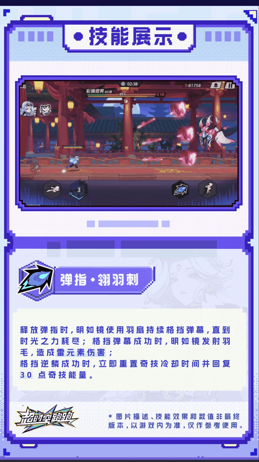 格挡弹幕成功时,明如镜发射羽毛,造成雷元素伤害;格挡逆鳞成功时,立即重置奇技冷却时间并回复30点奇技能量。