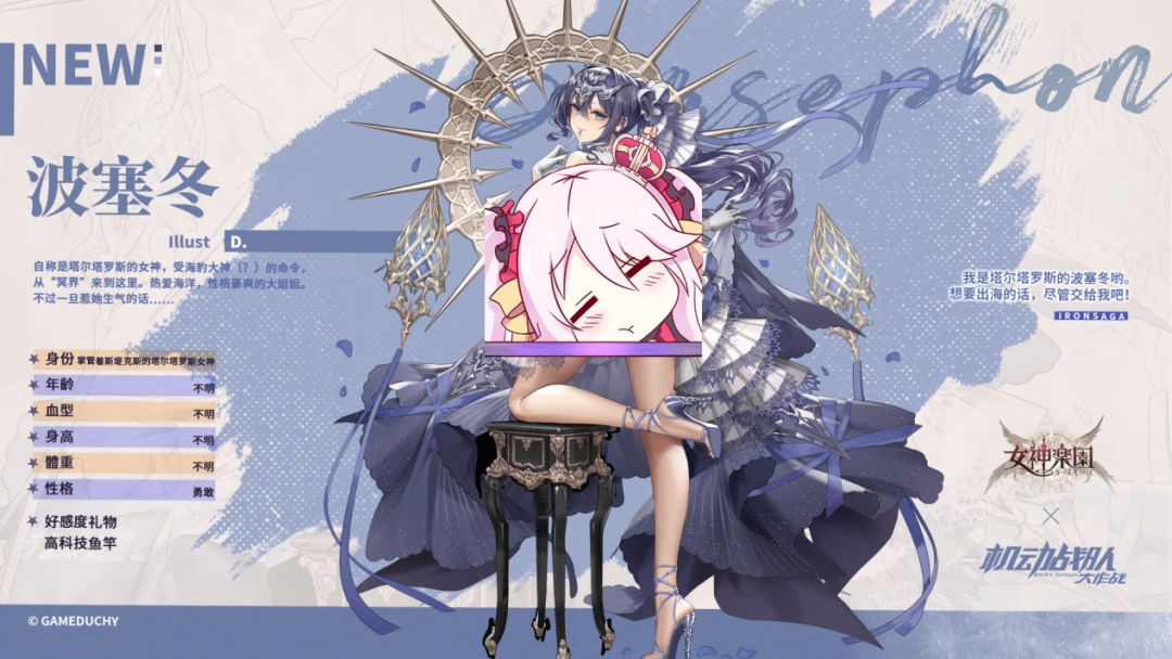 联动机师【波塞冬】:自称是塔尔塔罗斯的女神,受海豹大神(?)的命令,从“冥界”来到这里。热爱海洋,性格豪爽的大姐姐。不过一旦惹她生气的话……