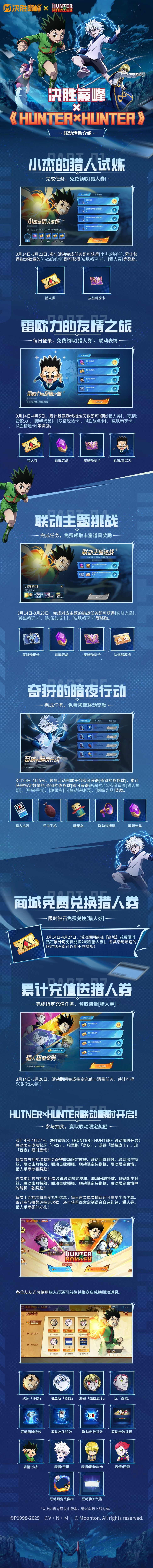 3月14日,《决胜巅峰》×《HUNTER×HUNTER》联动将正式开启,联动活动同步上线!参与活动即可获取全新限时联动皮肤狄牙「小杰」、哈里斯「奇犽」、游镰「酷拉皮卡」、琉「西索」。
