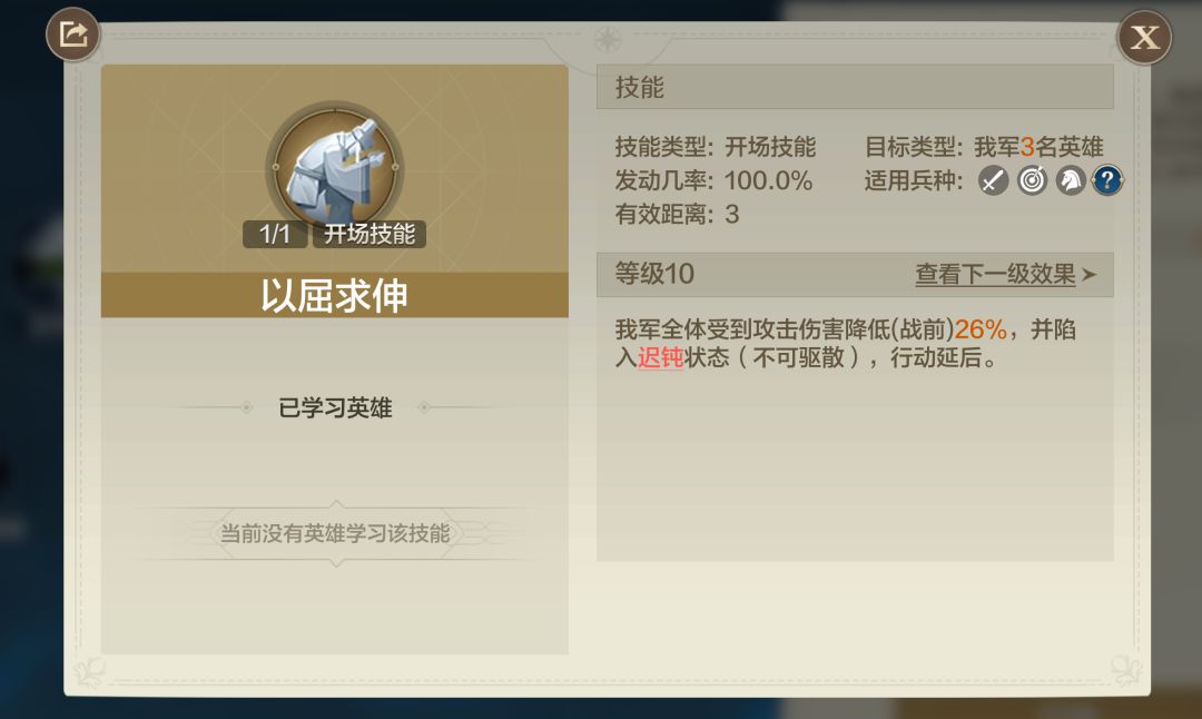 使我军统帅英雄获得可免疫2次伤害的闪避状态。并且敌军攻击属性最高的英雄造成伤害降低(战时)30%,持续1回合。