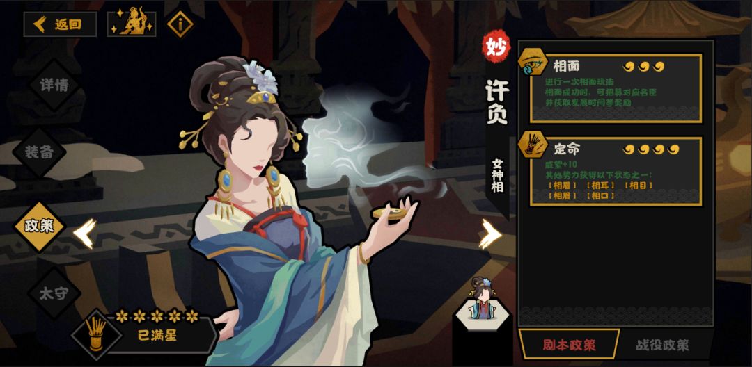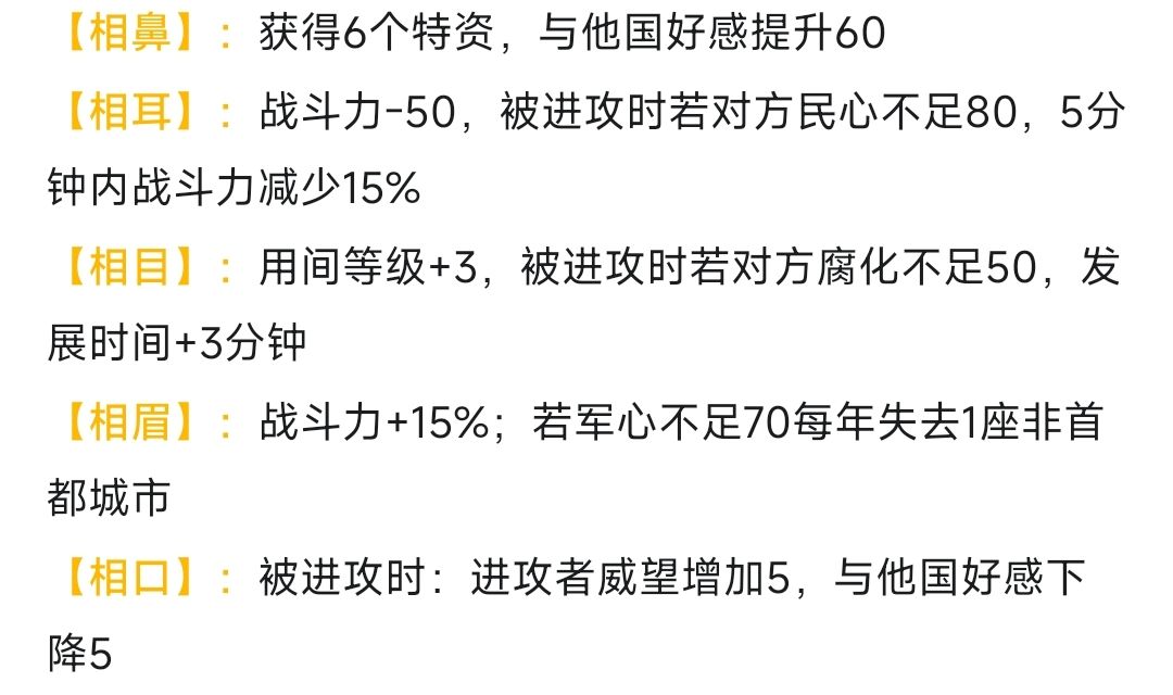 二政策是一个饱受争议的政策,效果如图。对于玩家来说,相鼻若在开会后使用,则为偏正面效果;相口由于威望贬值和好感重要性提高,为偏负面效果;相目、相眉则为纯负面效果;相耳描述存在争议:如果根据政策描述中同一主语来理解,则ai会减少15%战力,此时为纯正面效果;如果根据其他条目中一个正面+一个负面的设计模版,则为偏负面效果。从名臣政策上的星级来看,可能有些条目需要升星解锁,这说明许负存在通过卡星级来卡出特定条目的可能。