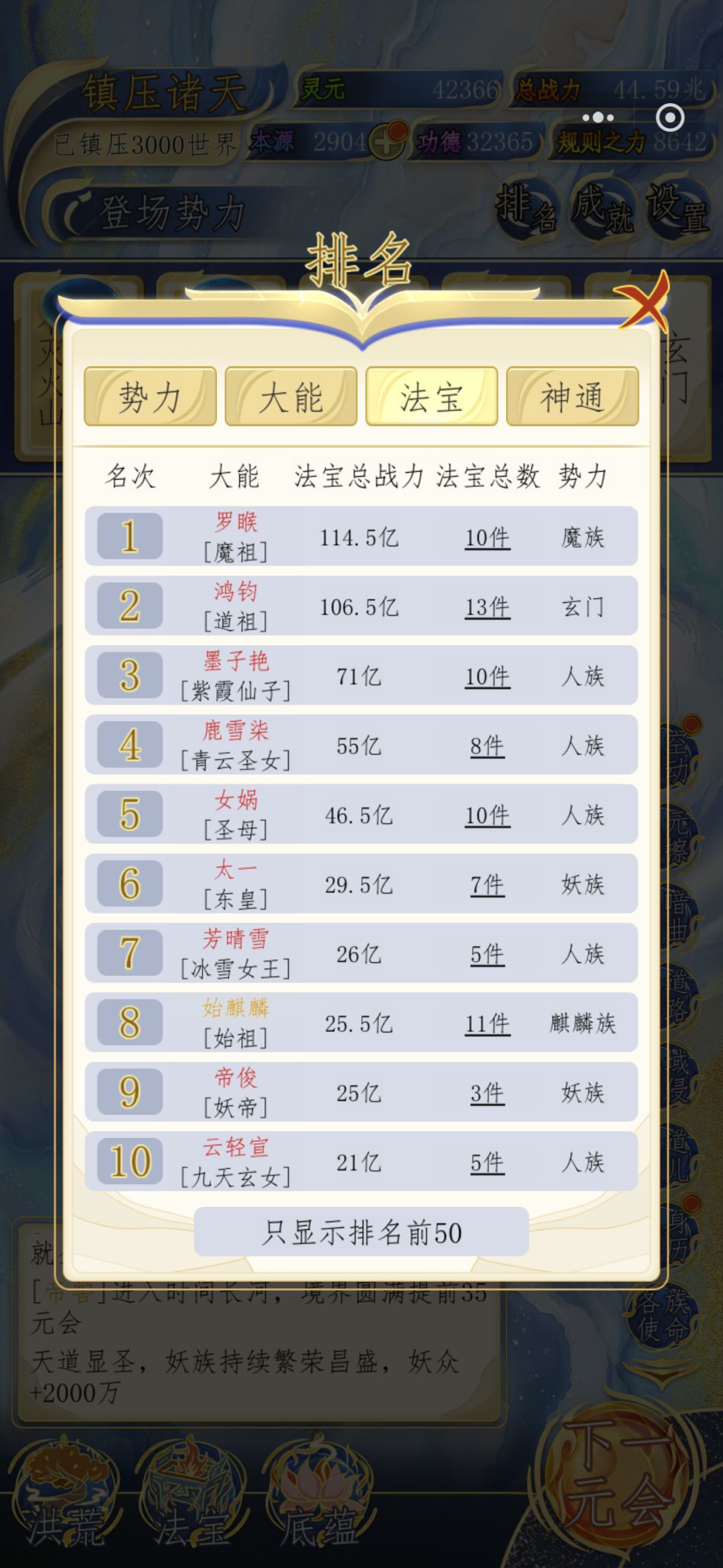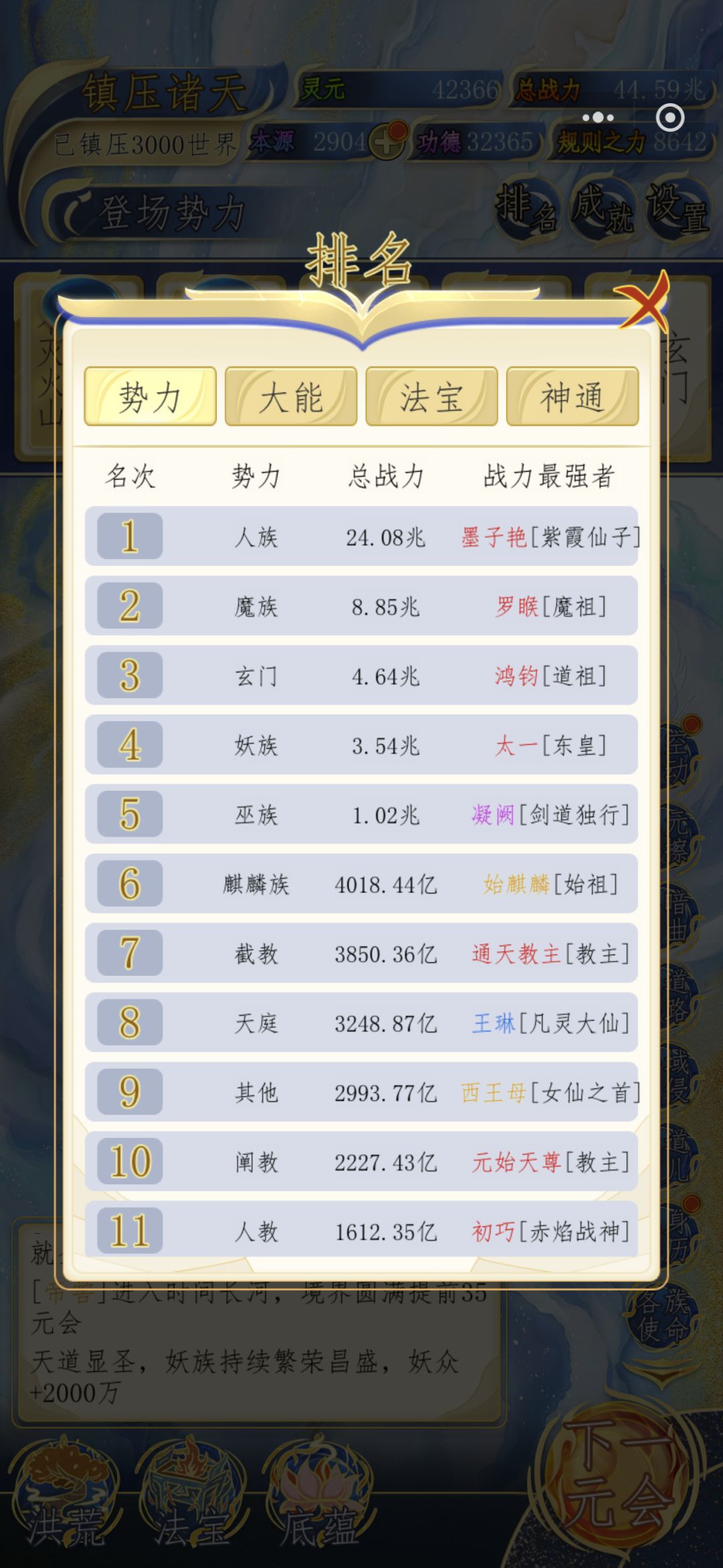 说正题,先说资源,所有资源都不怎么缺,本源重头到尾都缺,但也够用,最缺的就是鸿蒙紫气,这是限制境界也就是战力的最大问题,后面出了虚空涌动会好点。前面基本都是勉强够用。所以各族使命最强三族凝聚本源,后四名去转化灵元。功德就最后。否则本源前期就不够。