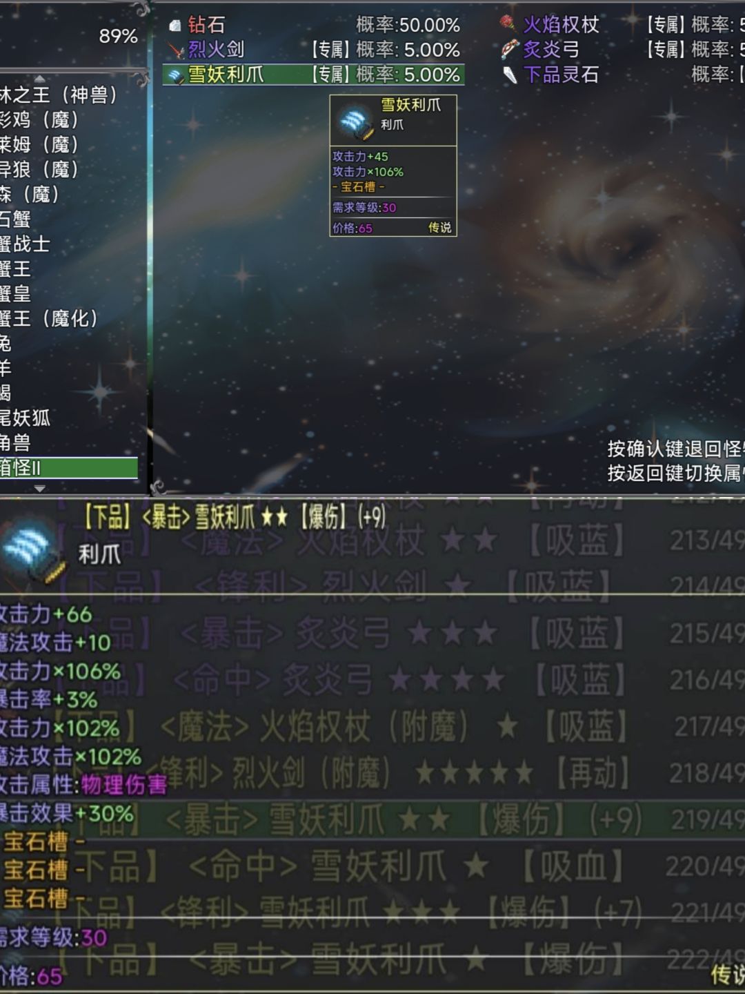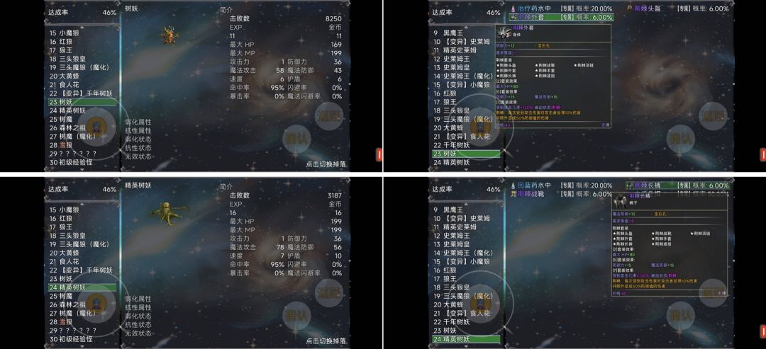 掉落的装备中,物抗加成和魔抗加成高的装备建议分别保留下来,图一的怪物分为纯物理怪和纯法术怪,刷怪时可换取对应属性装备
