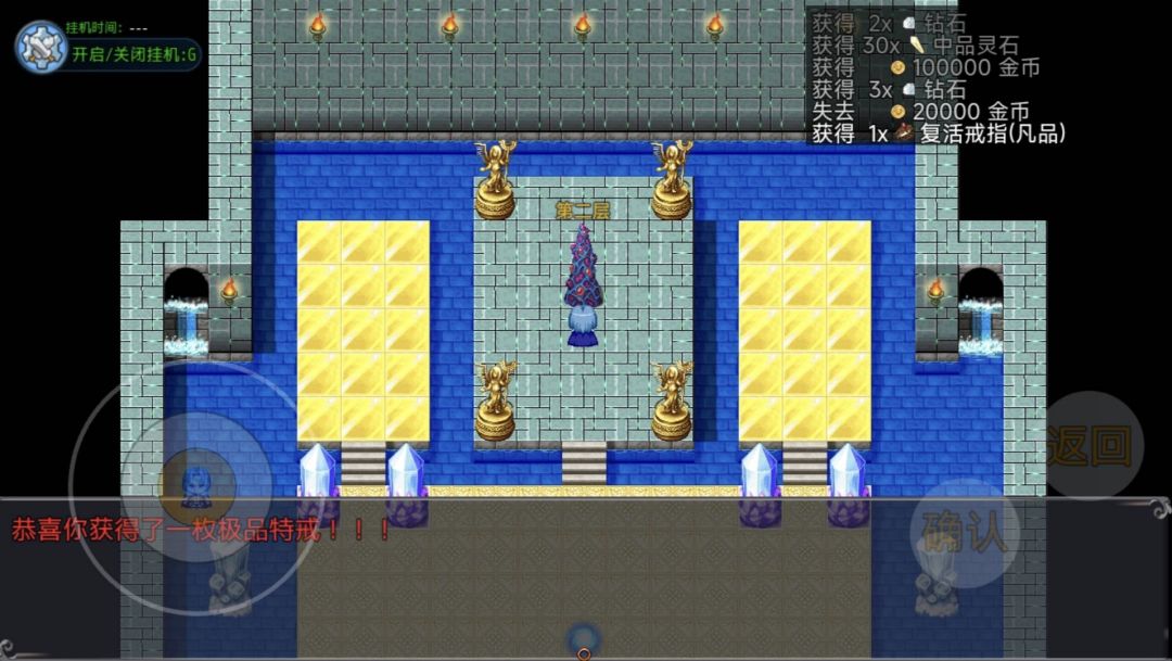 ③兑换麻痹戒指:刷取封魔塔(半小时一次),积攒50个特戒碎片兑换麻痹戒指(封魔塔的每个怪都存在隐藏掉落特殊戒指,几率很小,3-4层、7-8层隐藏掉落物理输出神器)