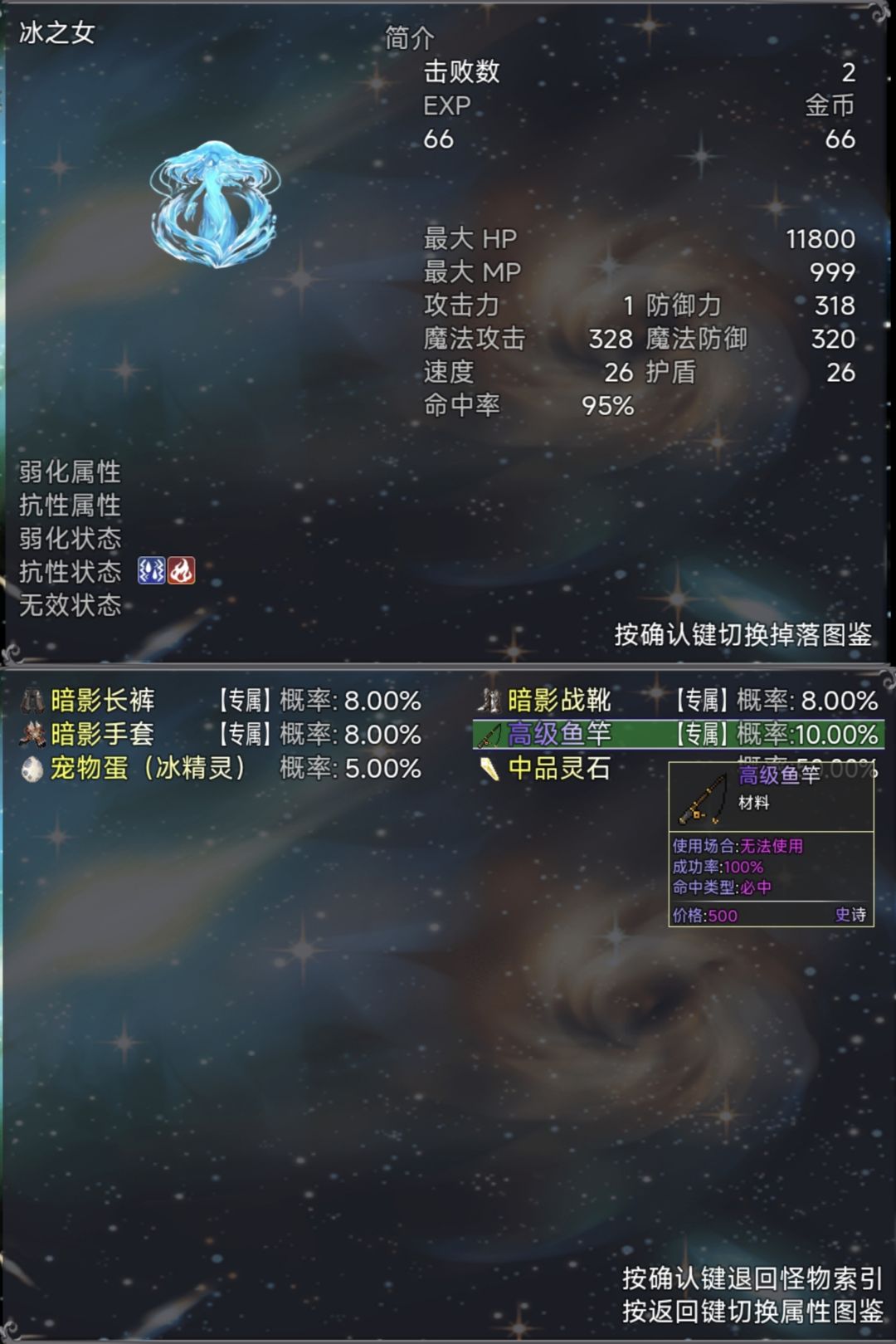 明怪boss冰之女掉落高级鱼竿,精英掉落鱼饵,属性达标后尽早来刷取一根高级鱼竿