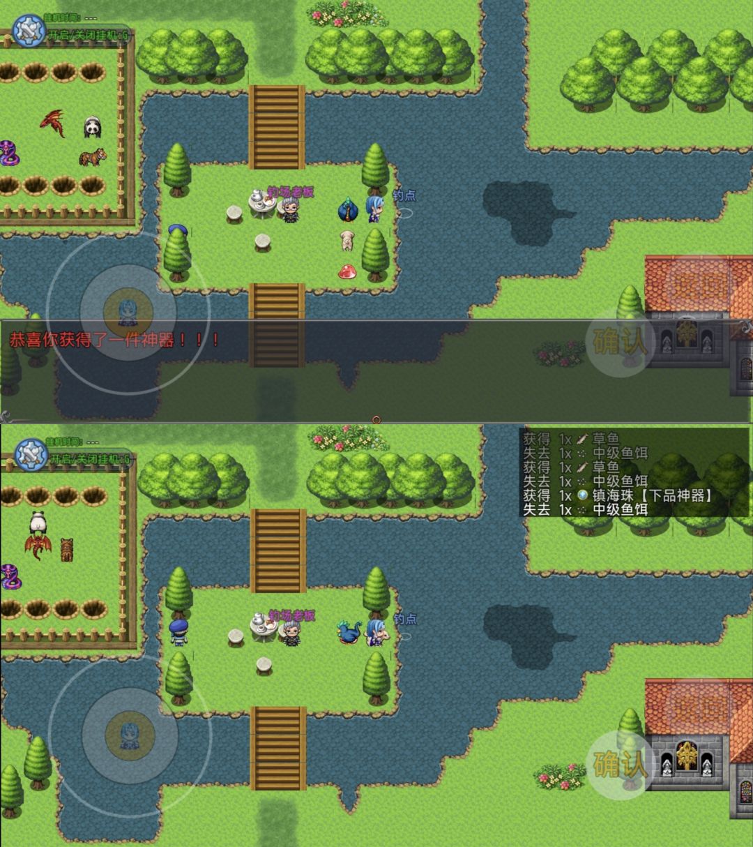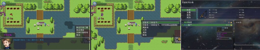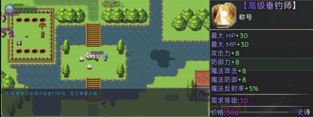 钓鱼点在老板右边,小鱼×59可兑换一次称号,前期每个角色必备,钓鱼过程几率遭到鱼咬每次损失10血量,注意购买药品补充血量