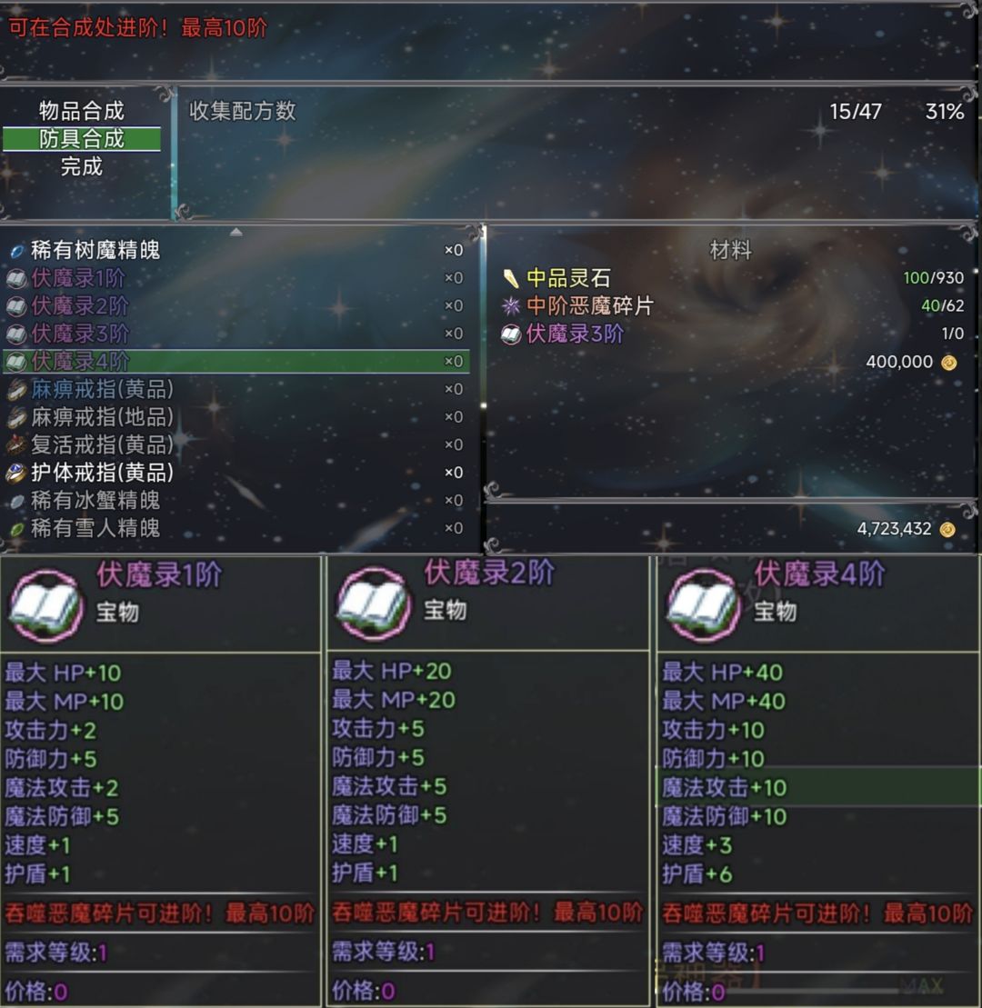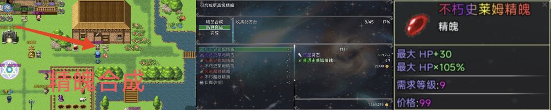 (4)合成高品质精魄,前期史莱姆精魄相较容易获取,可增加最大血量上限提升生存能力,合成地点位于云殇镇出生点右边