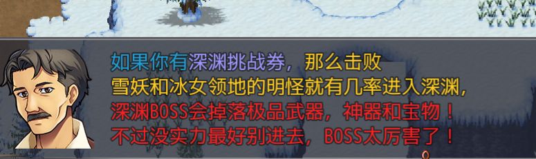 如果背包中有深渊门票,击败皇级怪冰之女皇、雪妖几率进入深渊(目前进入方式有bug),图二两个稀有boss、冰霜巨魔(魔化)boss、冰之女(魔化)boss、三种难度悬赏怪几率掉落深渊门票,钻石商店也可购买