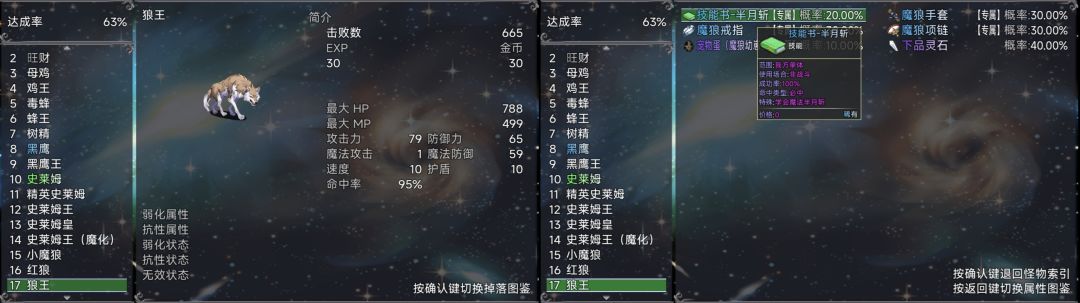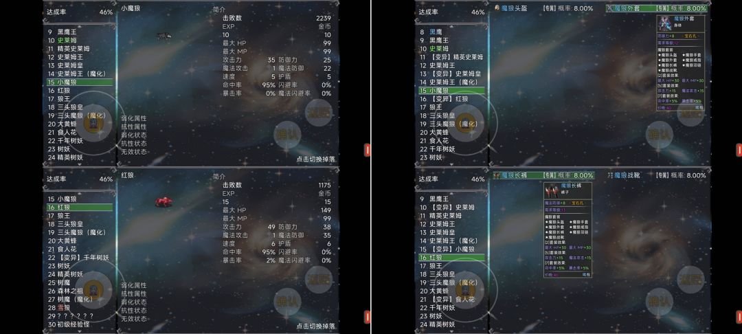 后续的怪是狼怪与树妖,狼怪位于森林右上方,树妖位于森林最右边的森林深处,建议提升一定实力后前往,狼怪与树妖的挂机难度高,可以手动操作刷几件装备,比如狼小怪掉落的魔狼外套(+8防御,12级可穿戴),狼精英掉落的魔狼长裤(+8魔抗装备,13级可穿戴)