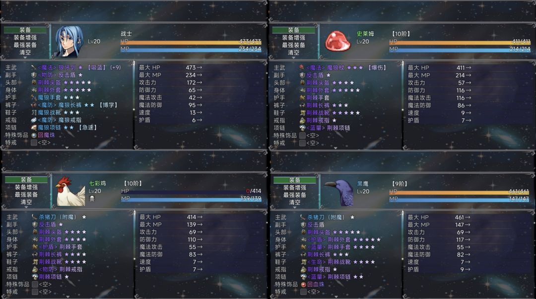 主角5魔狼2荆棘+反击盾,其余3角色反击盾+7荆棘,主角170物攻(镶嵌攻击宝石:中级钓鱼获取、sl稀有boss雪狼掉落;强化武器:中级钓鱼获取攻击卷轴;完成20次悬赏称号;购买宝物:钻石买完魔化控制器后攒钻石买199输出宝物),其余3角色110物抗,除奶妈外武器用附魔杀猪刀,有蓝孔装备可镶嵌生命宝石(图一左上角树精掉落),这个属性在之前版本已经能稳过了,翻车多尝试几次。